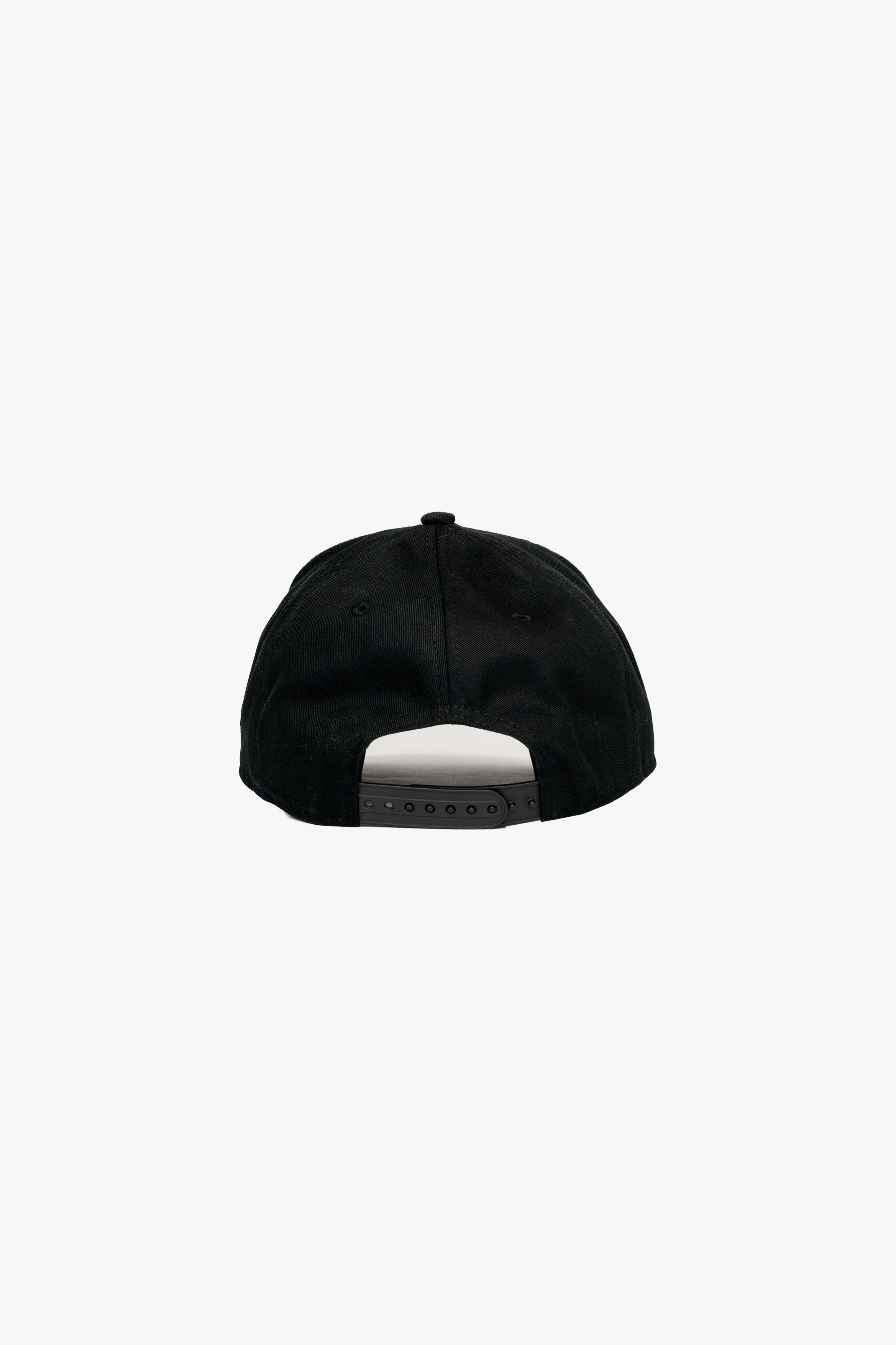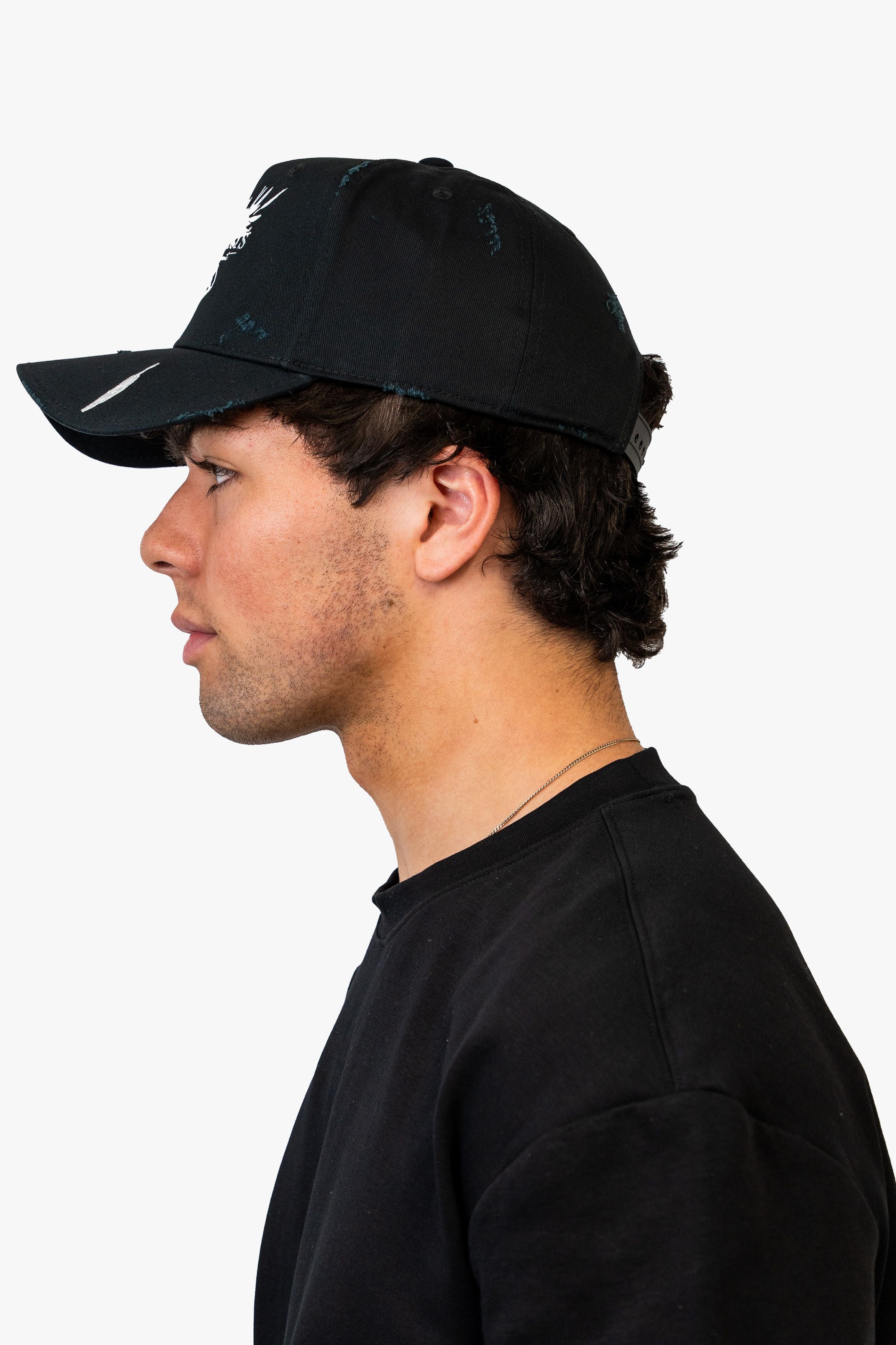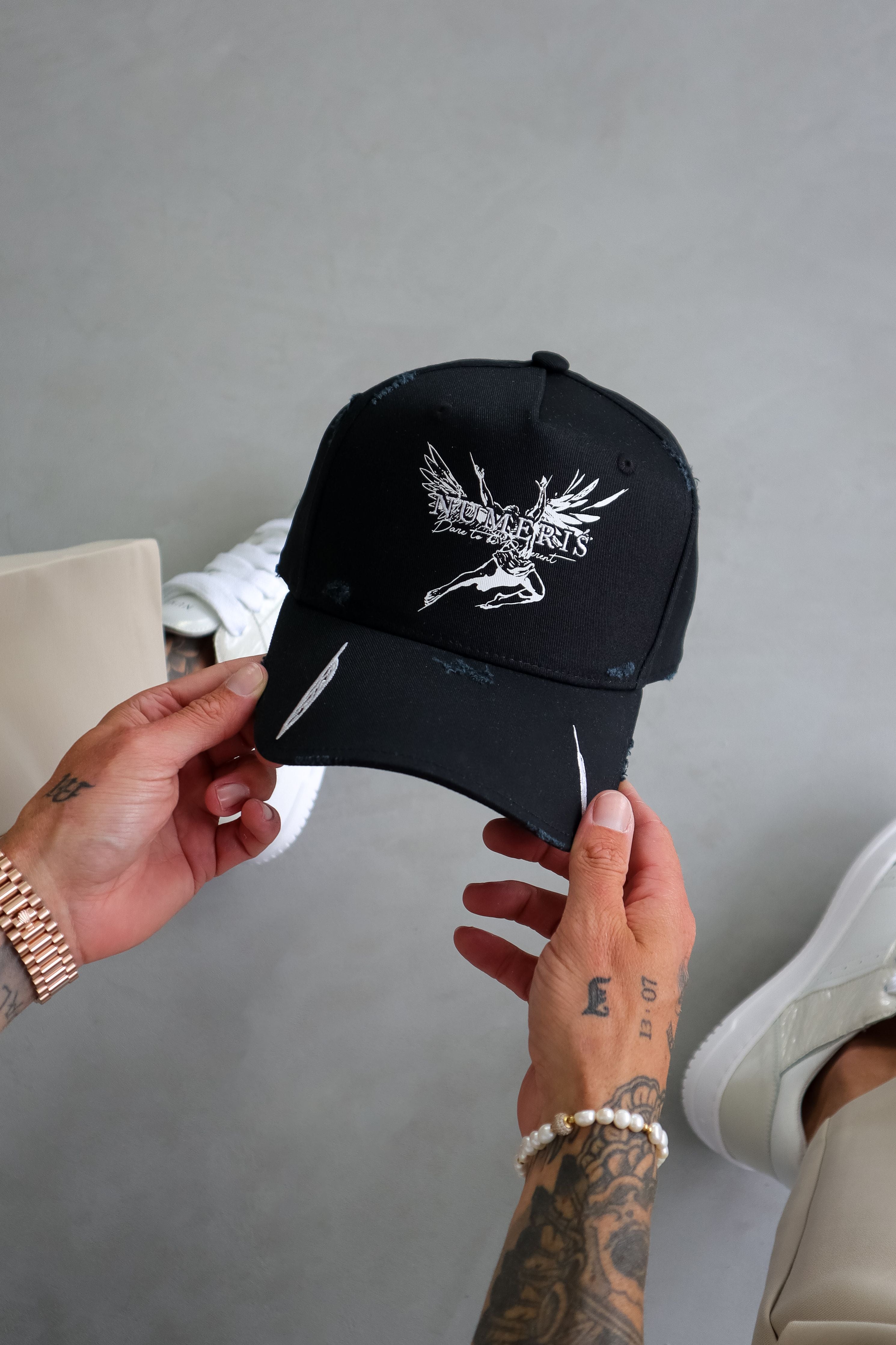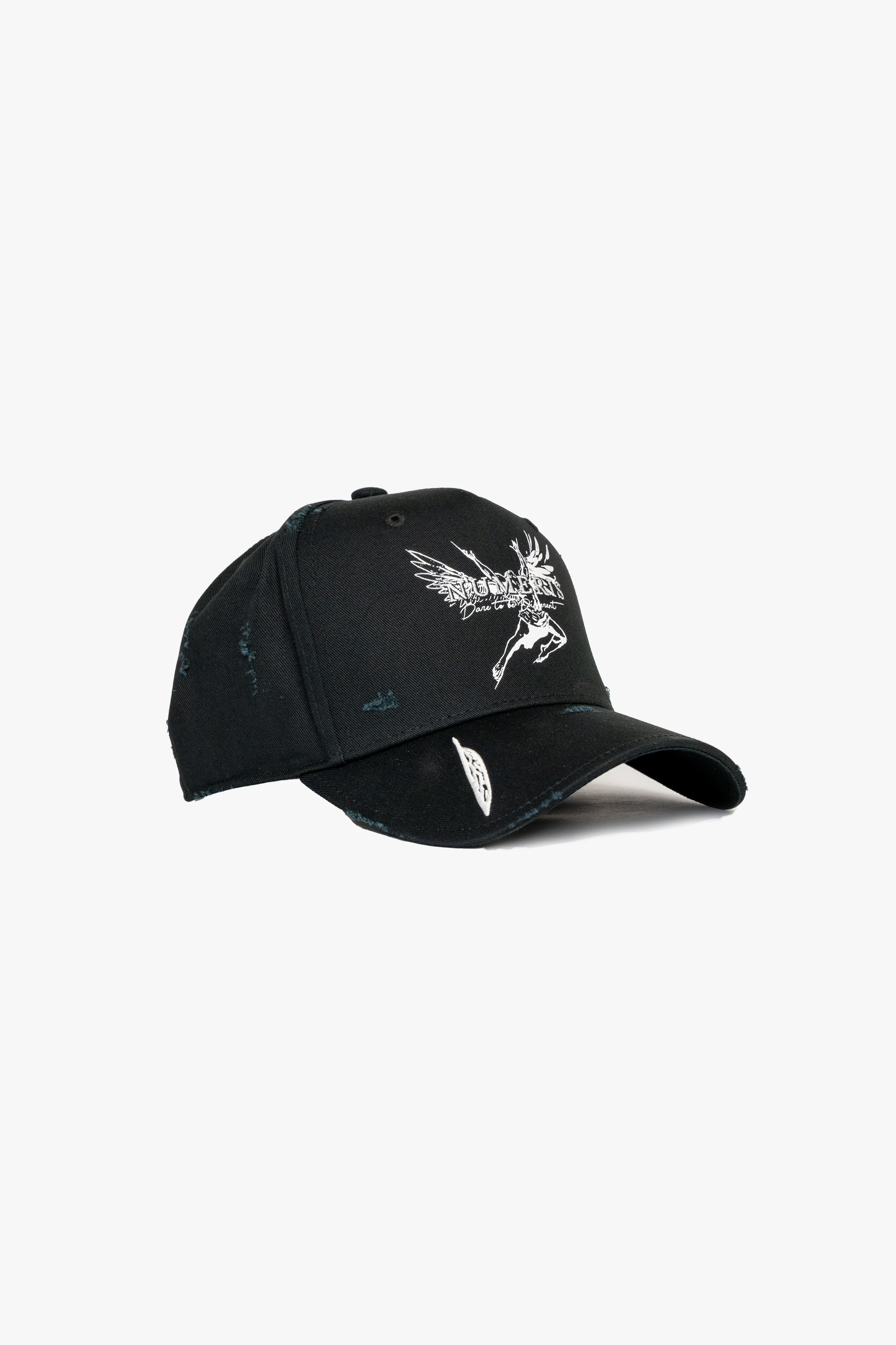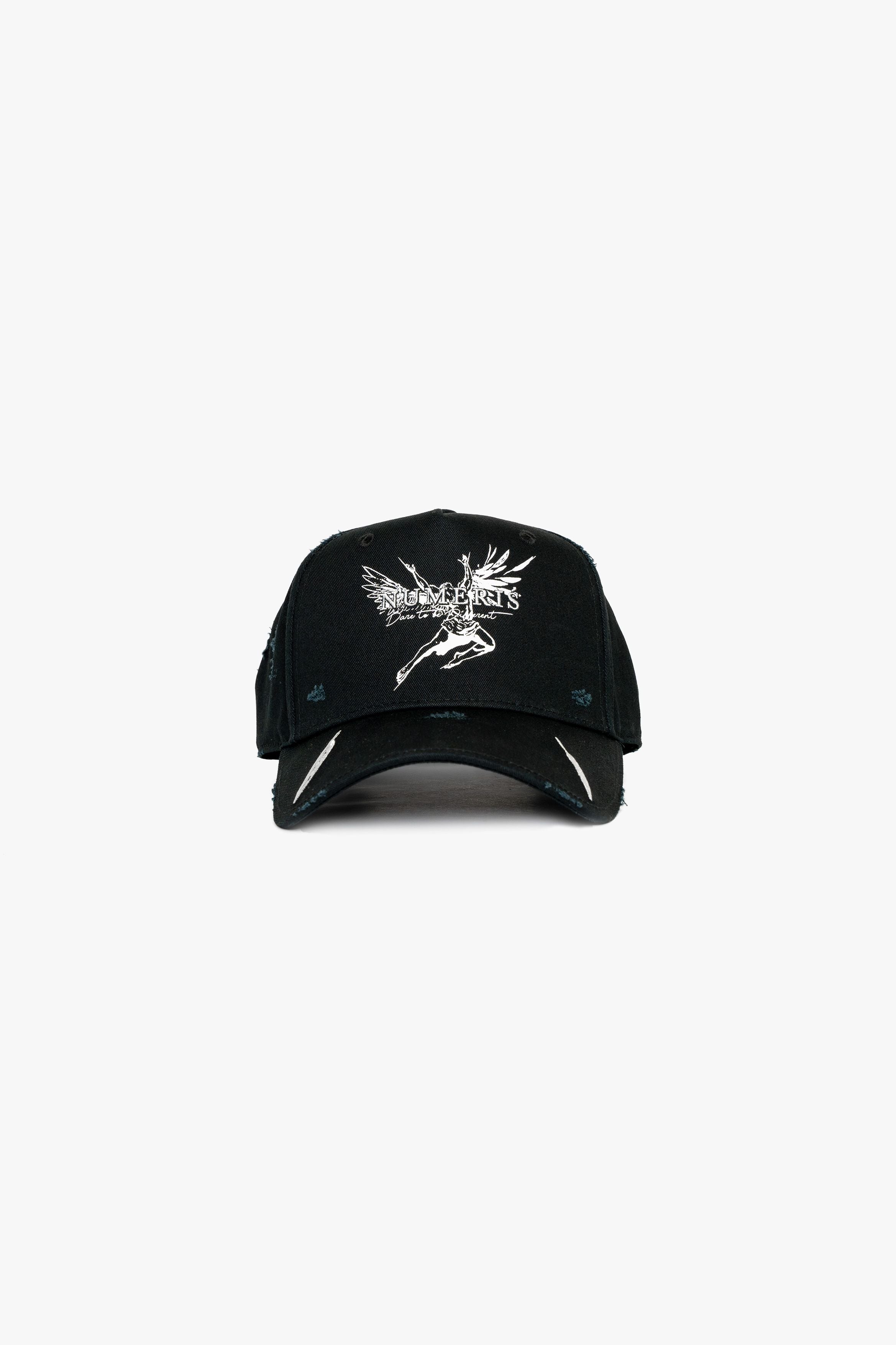 Black cotton canvas twill cap in a boxy silhouette with exaggerated dart at the centre front. Featuring our Feathers artwork in a mixture of crisp screen printing and embroidery.