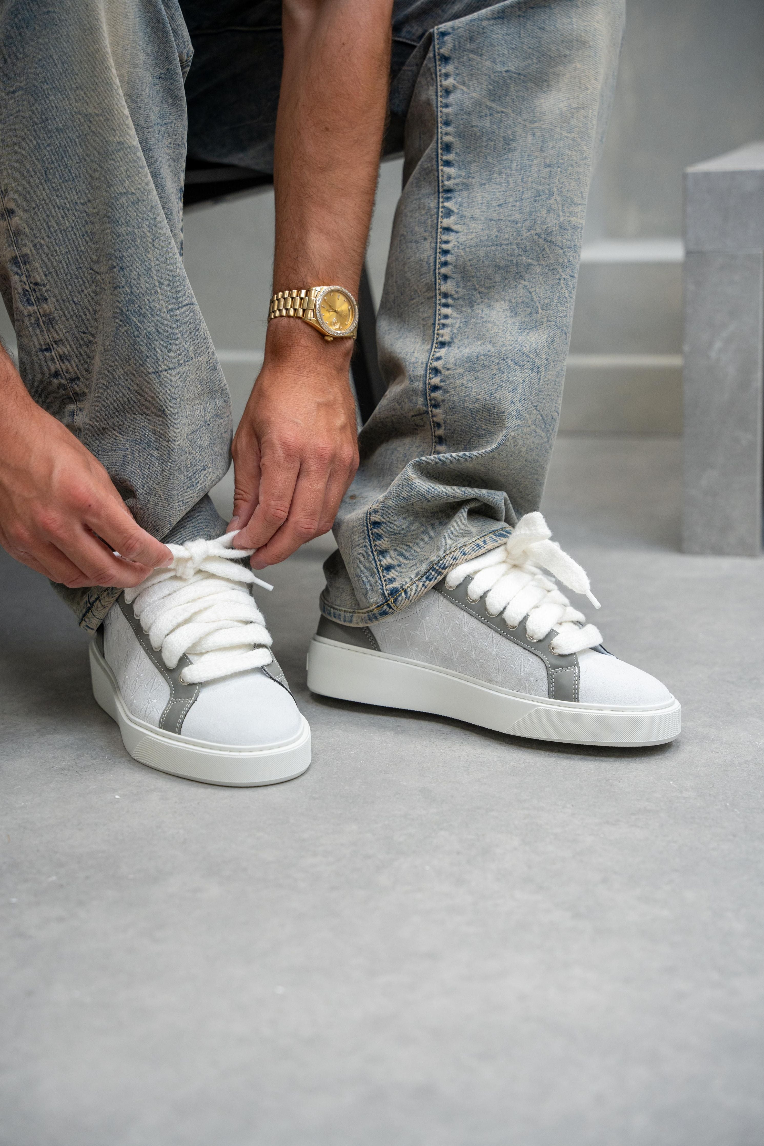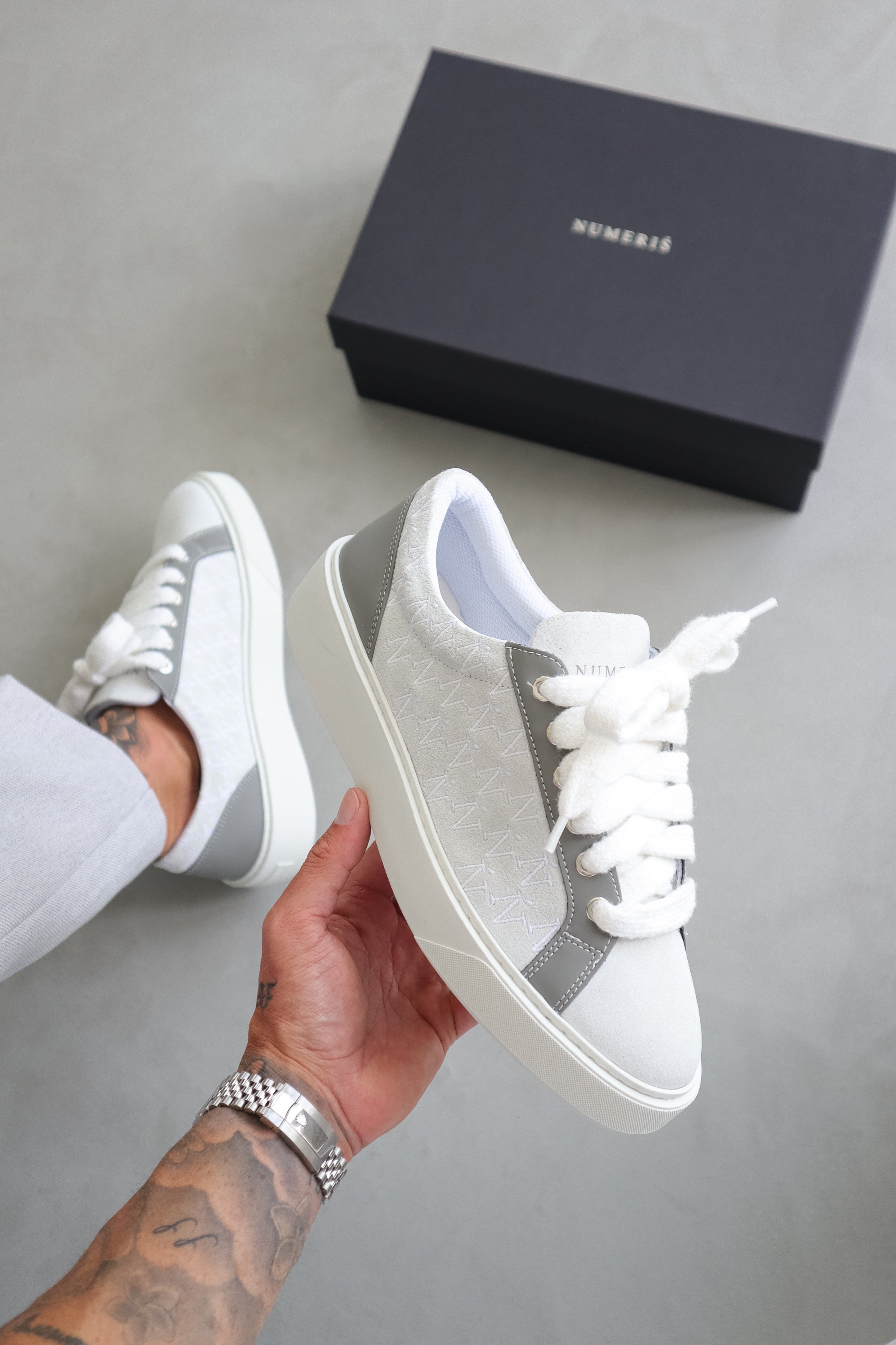 The Graphite colourway features Italian light grey, 10mm mohair white laces, light grey side panels and bespoke leather reinforced by TPU running down the eyestay. Which are accompanied by our sleek hand embroidered Ń monogram logo. The interior of the sneaker features black collar lining providing unrivalled comfort. The upper rests perfectly on top of our brand new complex rubber sole, exclusively made for Sigńet. Our distinct silver logo is positioned across the tongue.