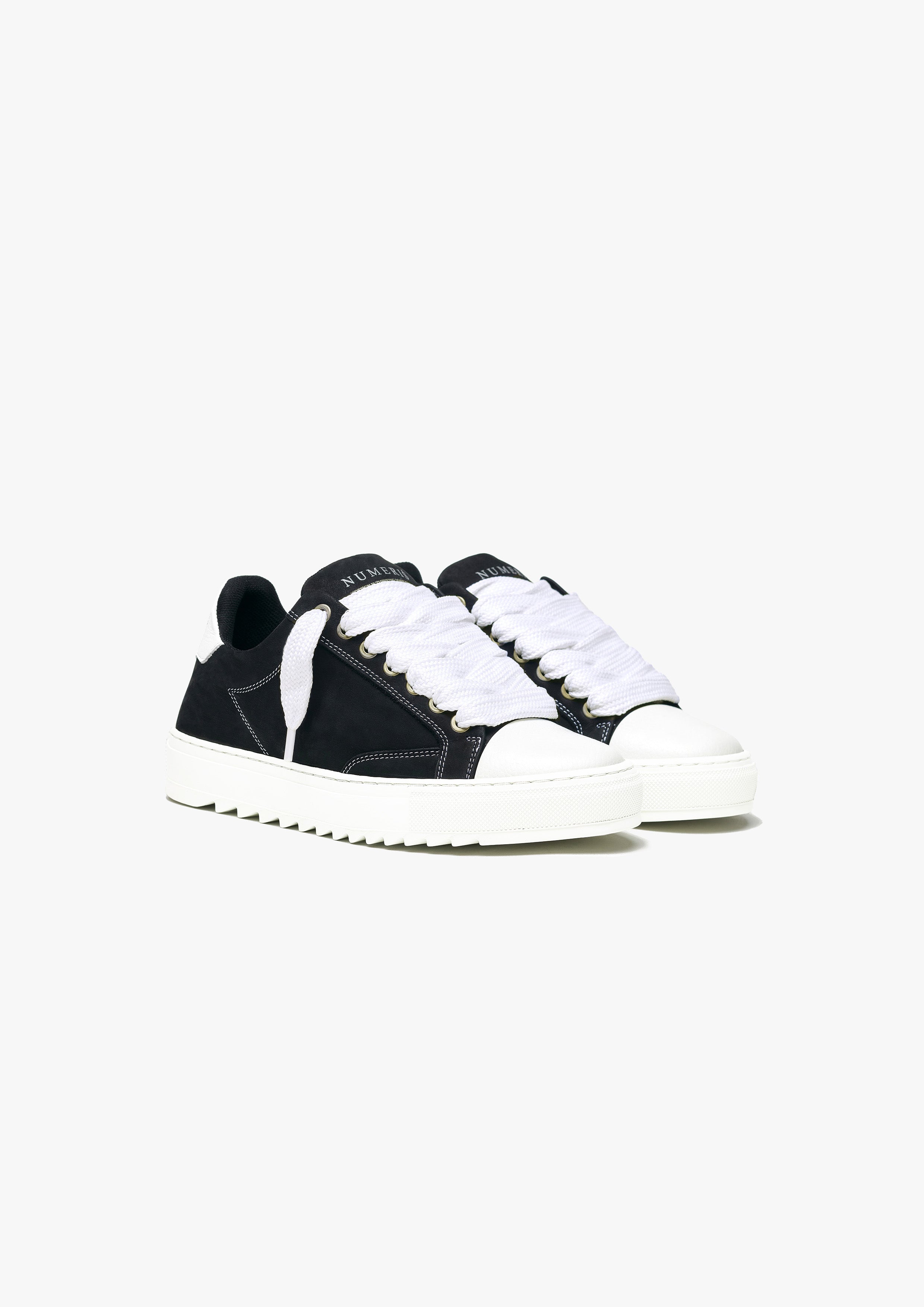 The Atelier trainer was inspired by Parisian lifestyle. Every stitch and detail was meticulously designed in a Parisian workshop. The Atelier features a premium black nubuck upper with crisp white stitching and finished with our signature pebbled leather white toe cap. The interior of the trainer features collar lining providing unrivalled comfort. The final touches see our Numeriś branding on the heel of the shoe, with our slogan for this style 'Design is thinking made visual' on the tongue.