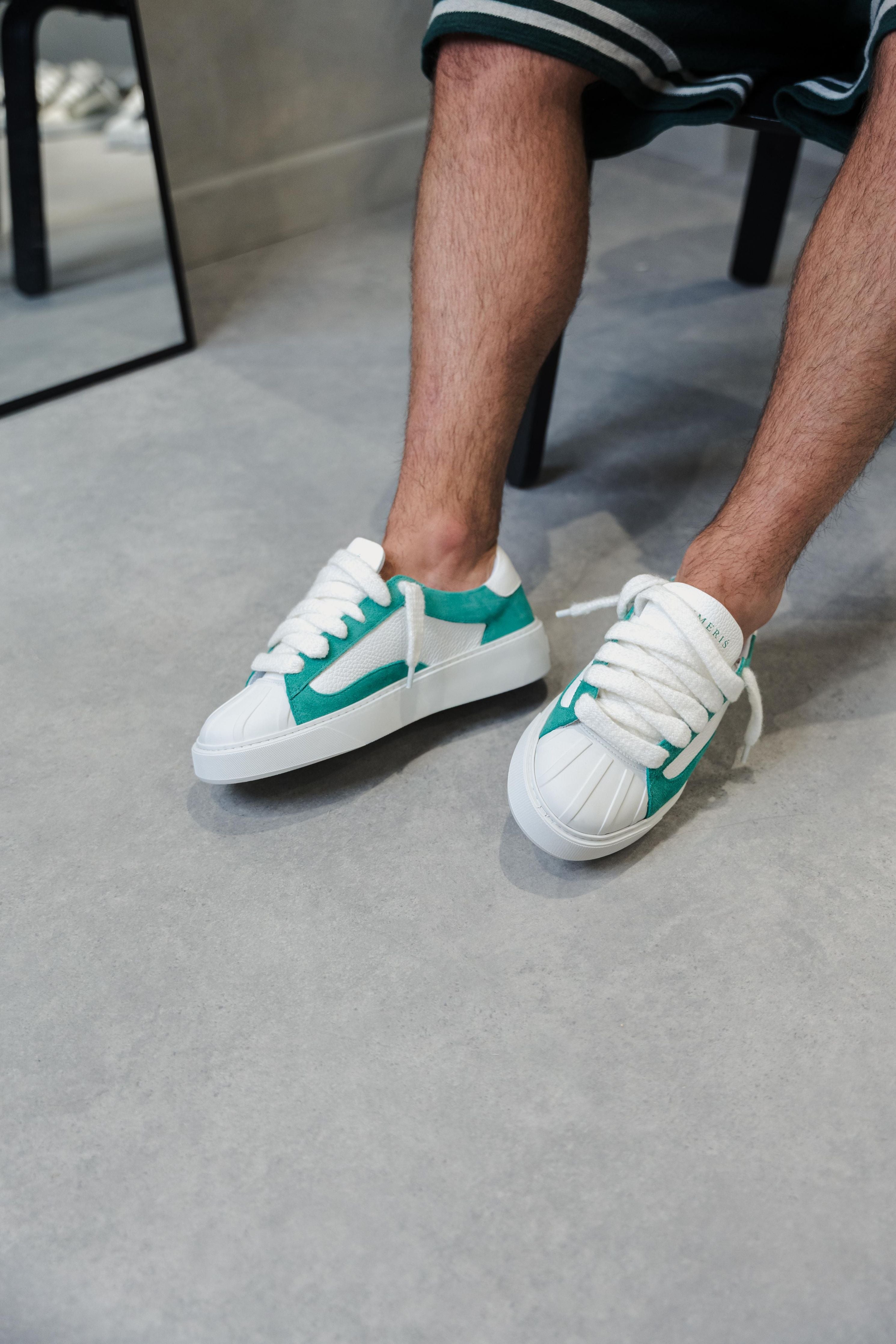 The Teal colourway features a mix of Italian suede and leathers. With 10mm wide mohair laces, each pair is soft to the touch and slightly textured. Numeris branding is positioned along the tongue, creating a clean aesthetic. All of this rests upon our custom-engineered sole, developed exclusively for the Eclipse - to support the rubber shell toe.