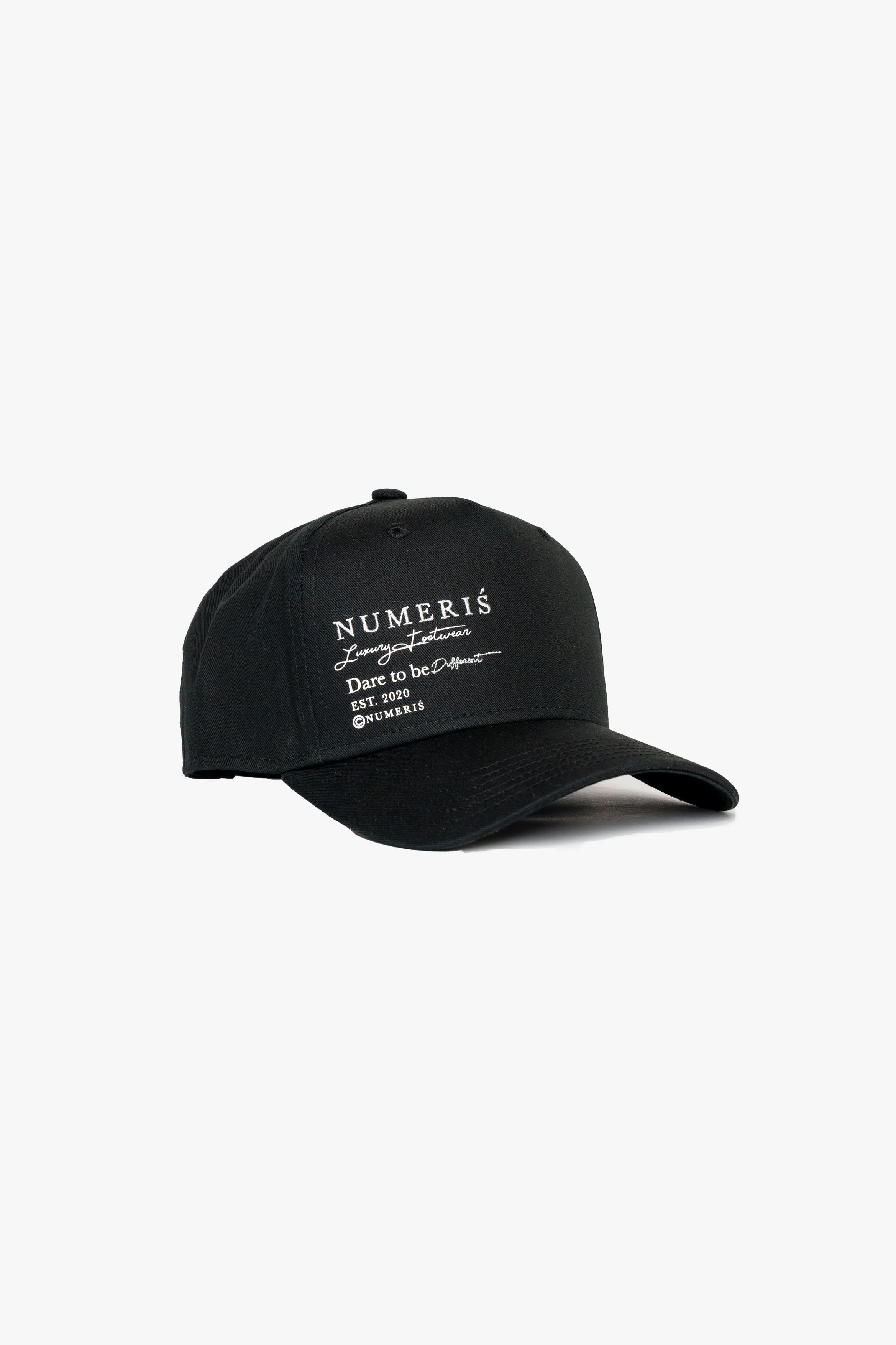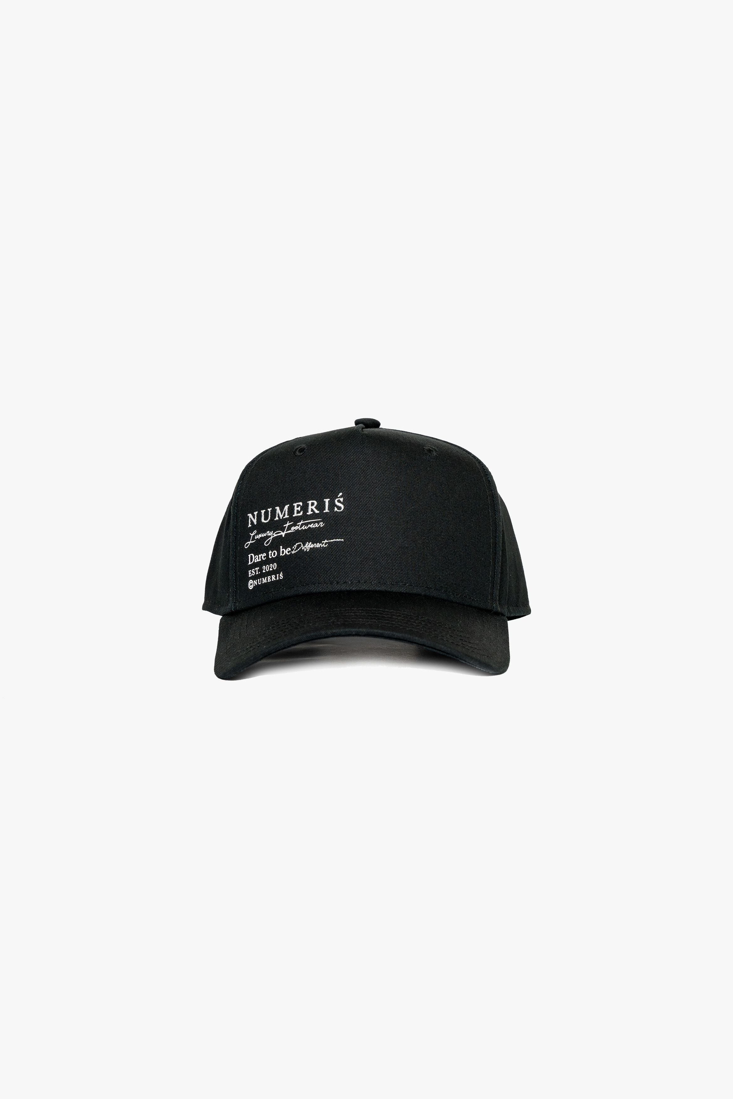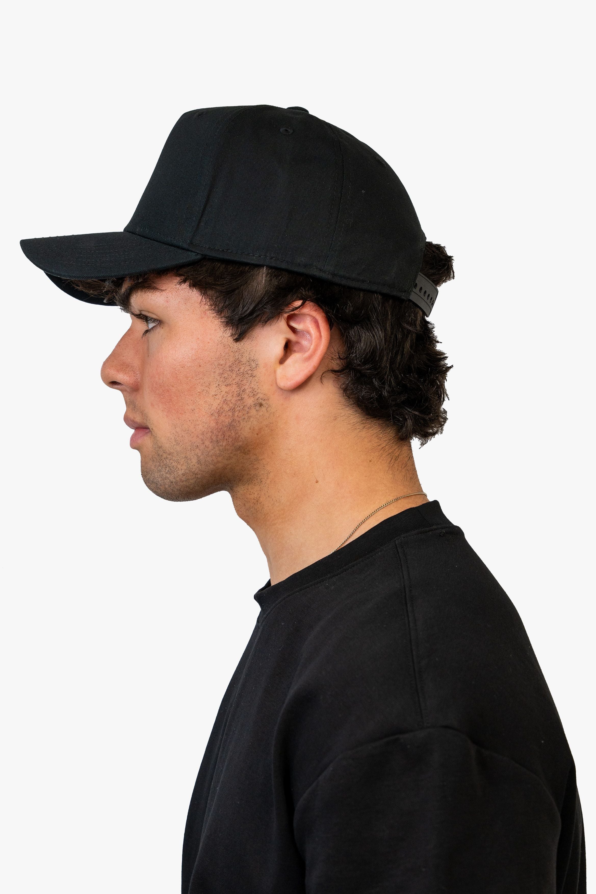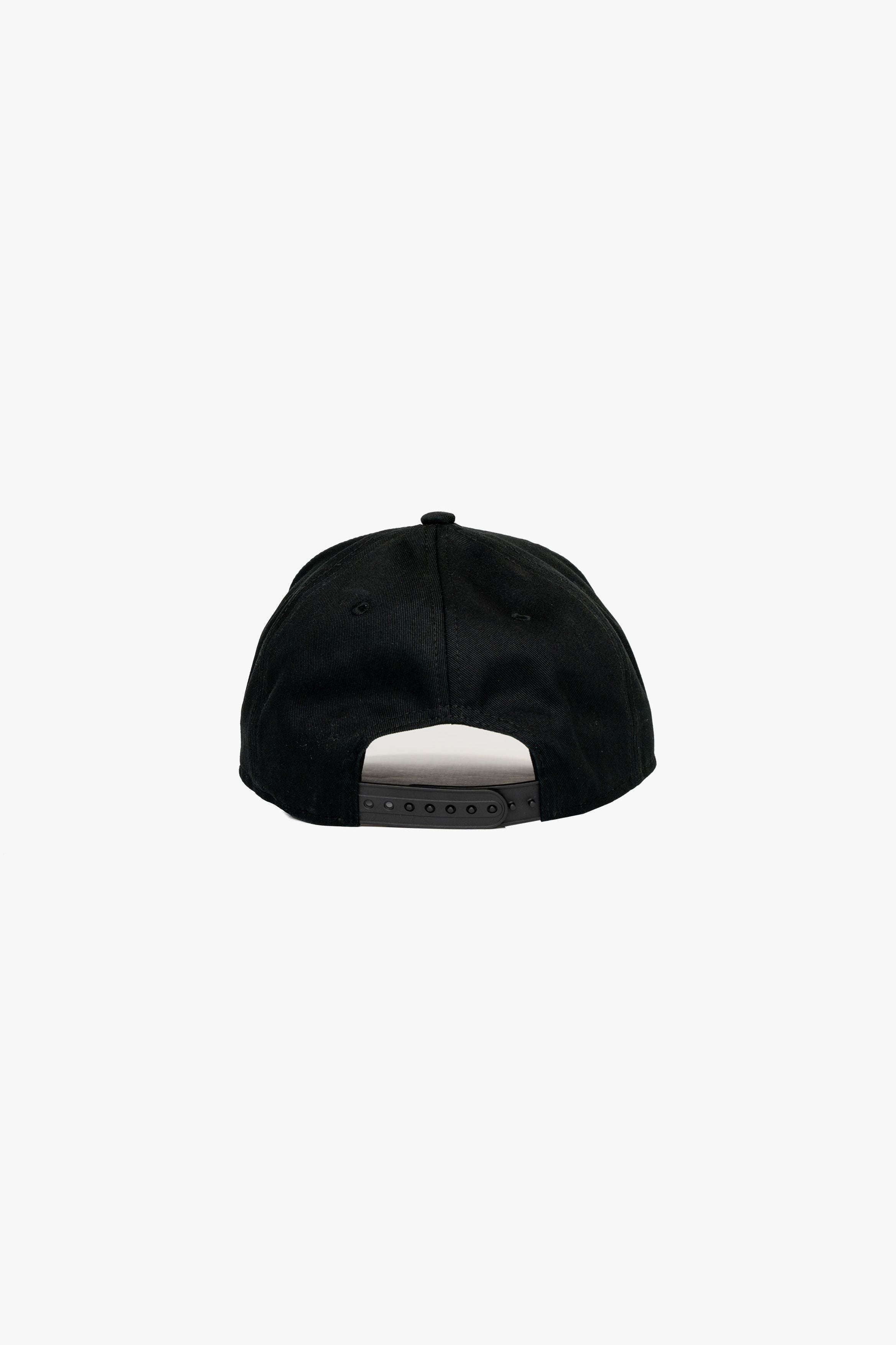 Black cotton canvas twill cap in a boxy silhouette with exaggerated dart at the centre front. Featuring our Patent artwork in a mixture of crisp screen printing and embroidery.