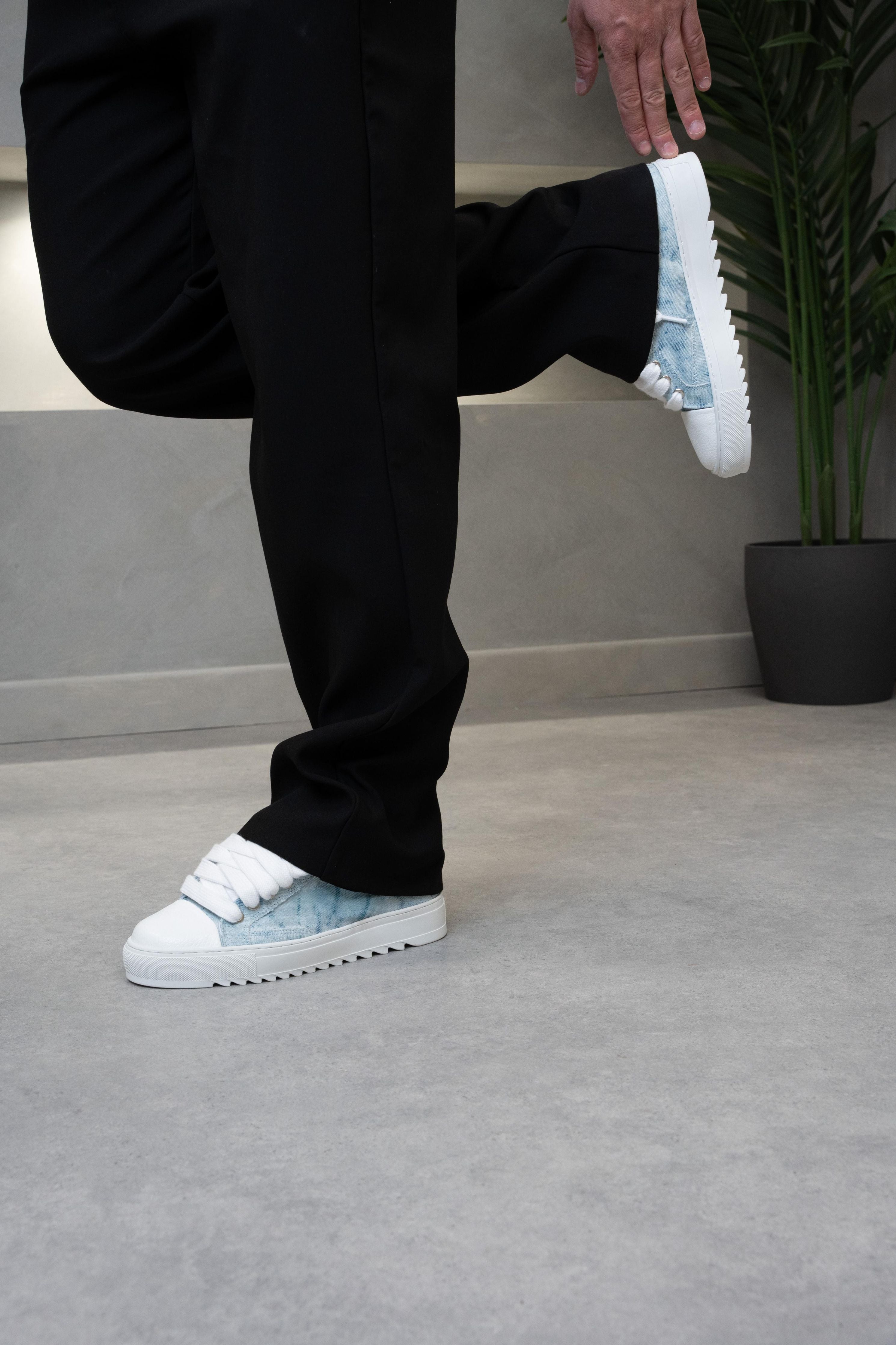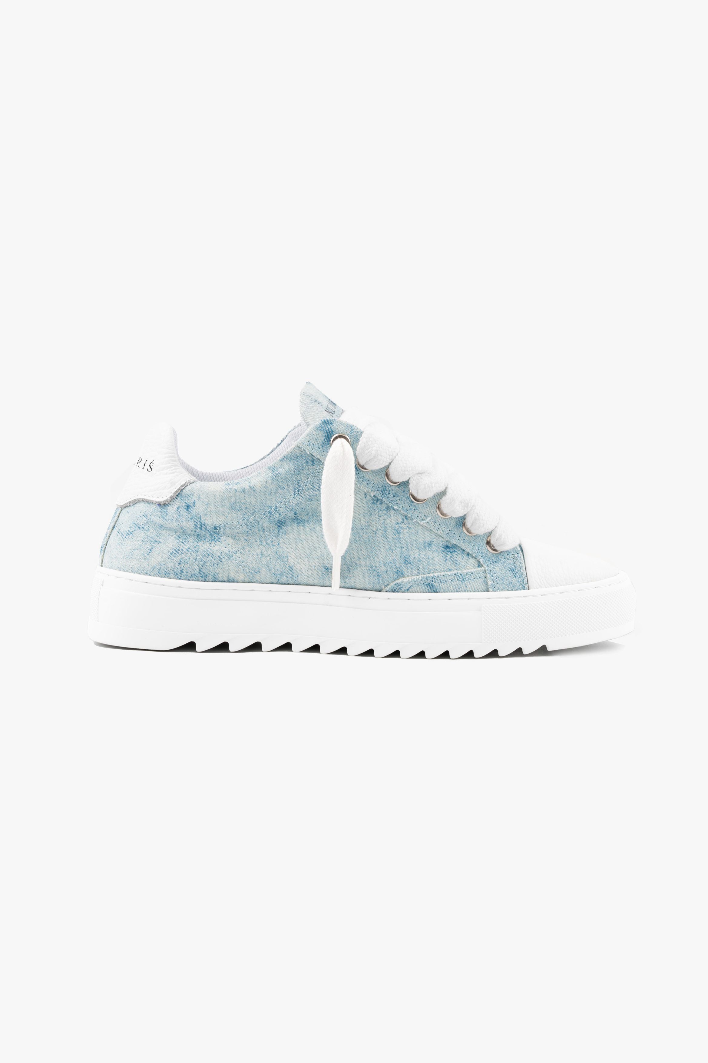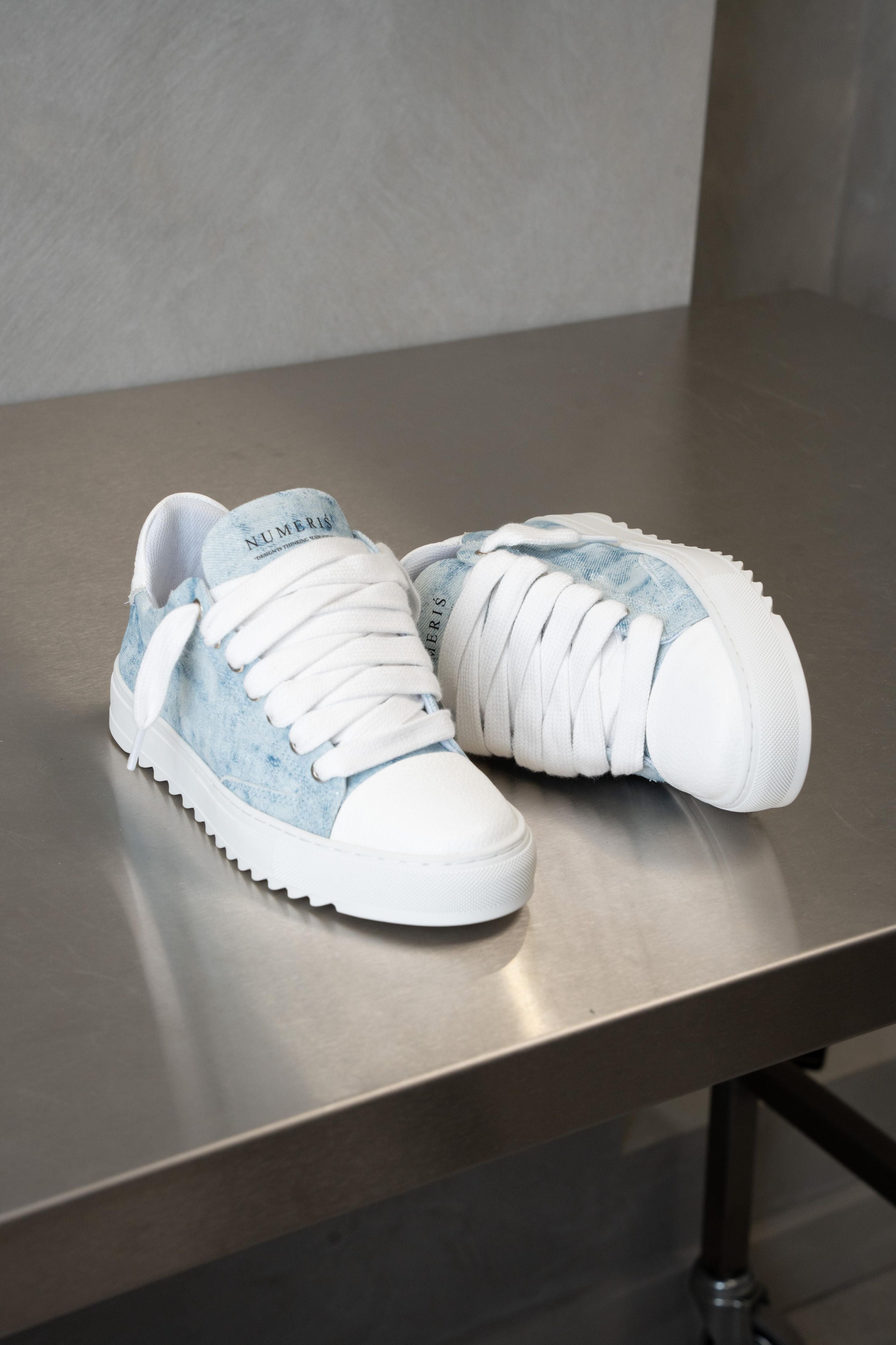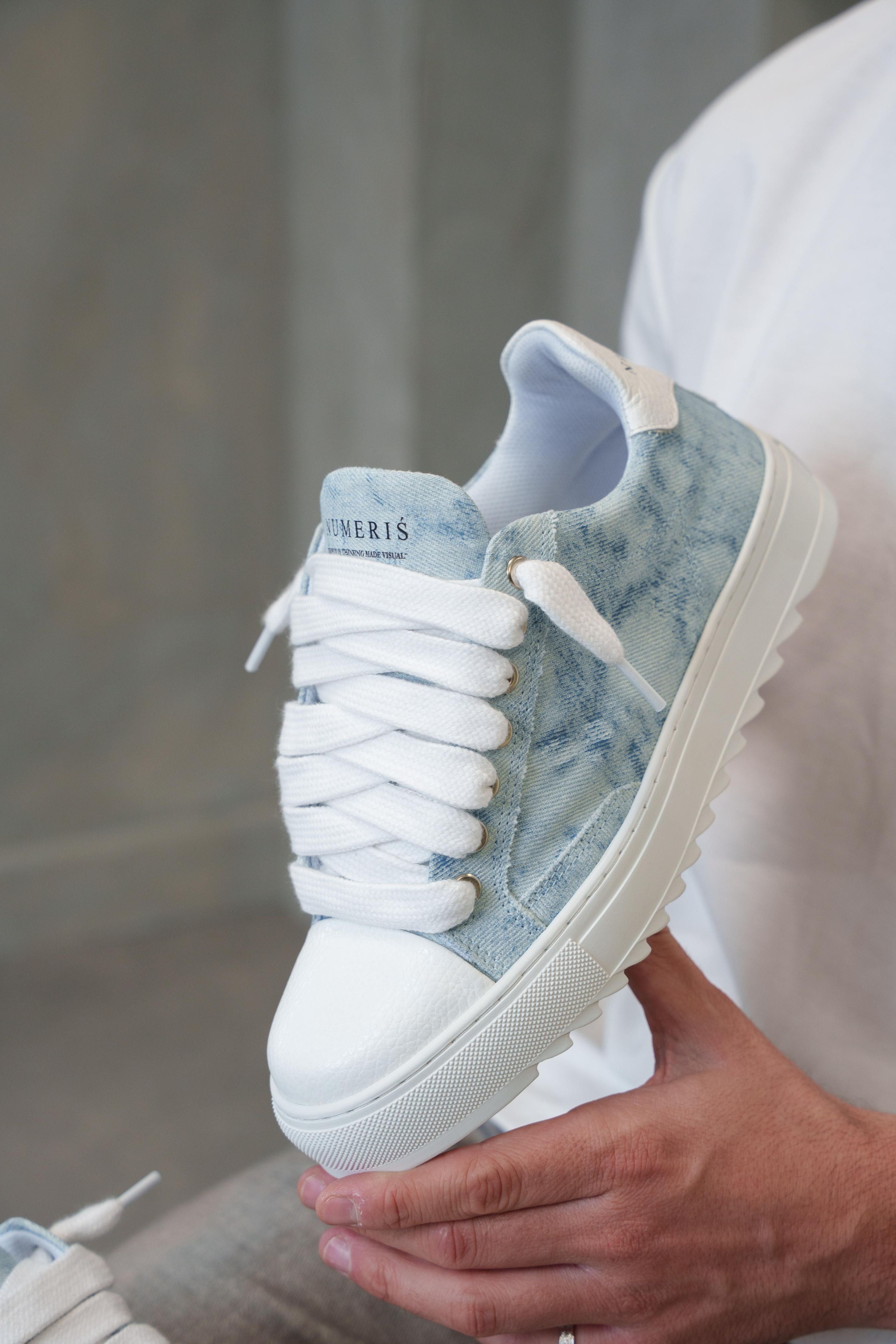 Crafted with meticulous attention to detail, the bespoke hand-painted denim upper ensures that each pair is a unique work of art, as no two pairs will bear the same pattern. Complementing this distinctive feature is the signature crisp white pebbled leather toe cap, adding a touch of sophistication to the design. Inside, the trainer boasts a comfortable collar lining that enhances the overall wear experience. The finishing touches include our distinctive Numeriś branding on the heel.