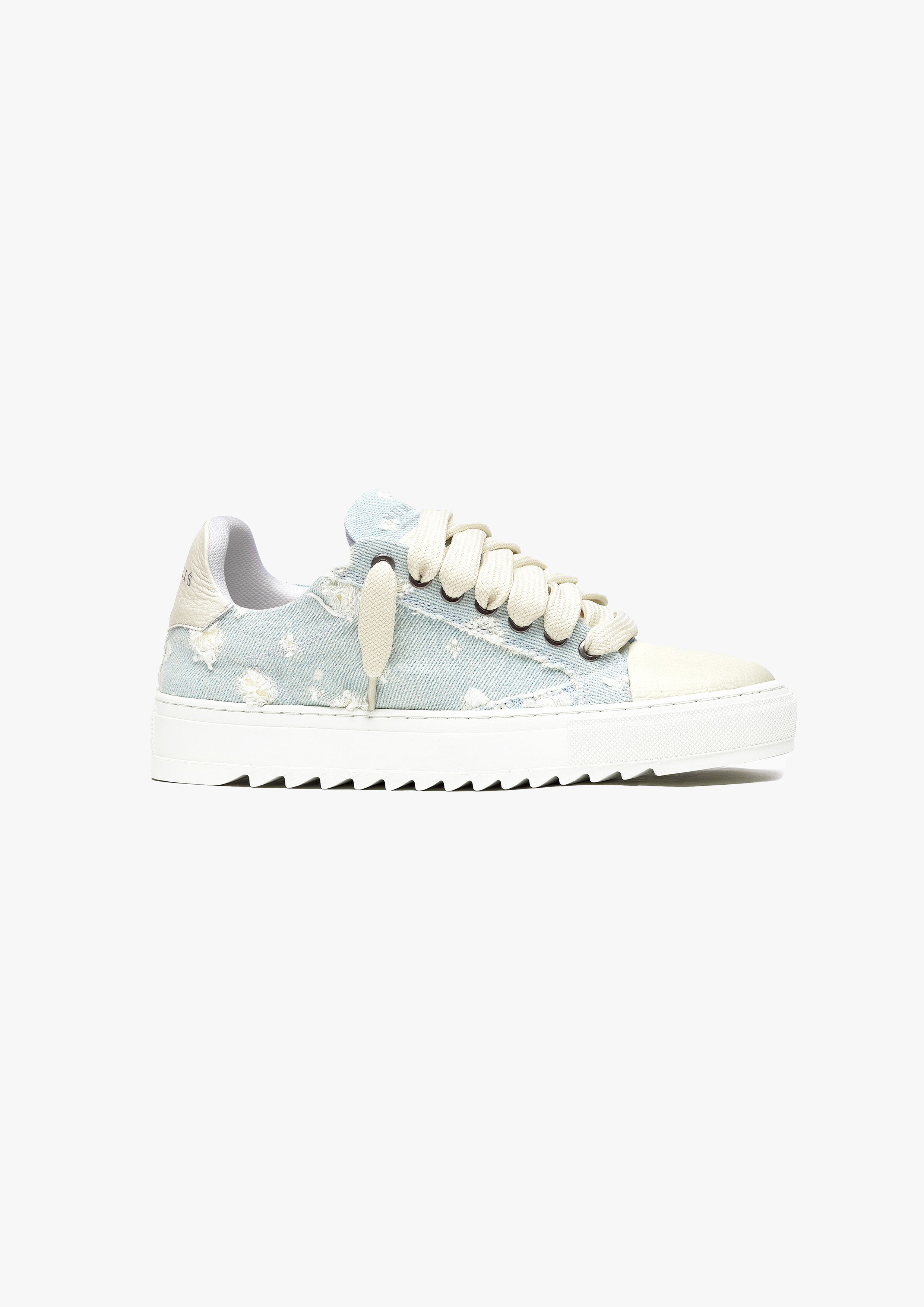 Crafted with meticulous attention to detail, the bespoke hand-distressed light wash denim upper ensures that each pair is a unique work of art, as no two pairs will bear the same distressed pattern. Complementing this distinctive feature is the signature vintage white pebbled leather toe cap, adding a touch of sophistication to the design. Inside, the trainer boasts a comfortable collar lining that enhances the overall wear experience. The finishing touches include our distinctive Numeriś branding on the heel, accompanied by the style-defining slogan, 'Design is thinking made visual.'