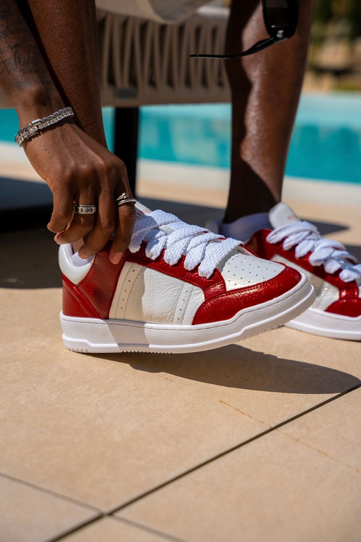 The Arena Sneaker combines everyday luxury and sportswear aesthetic. Arriving in vibrant colorways, the Cherry colourway features a full glossy Italian leather upper - which is complimented with white textured 10mm laces. The interior of the trainer features collar lining providing unrivalled comfort. The upper rests perfectly on top of our custom white sole. The sole itself features Numeriś branding embossed on the rear and is engraved on the under-sole.