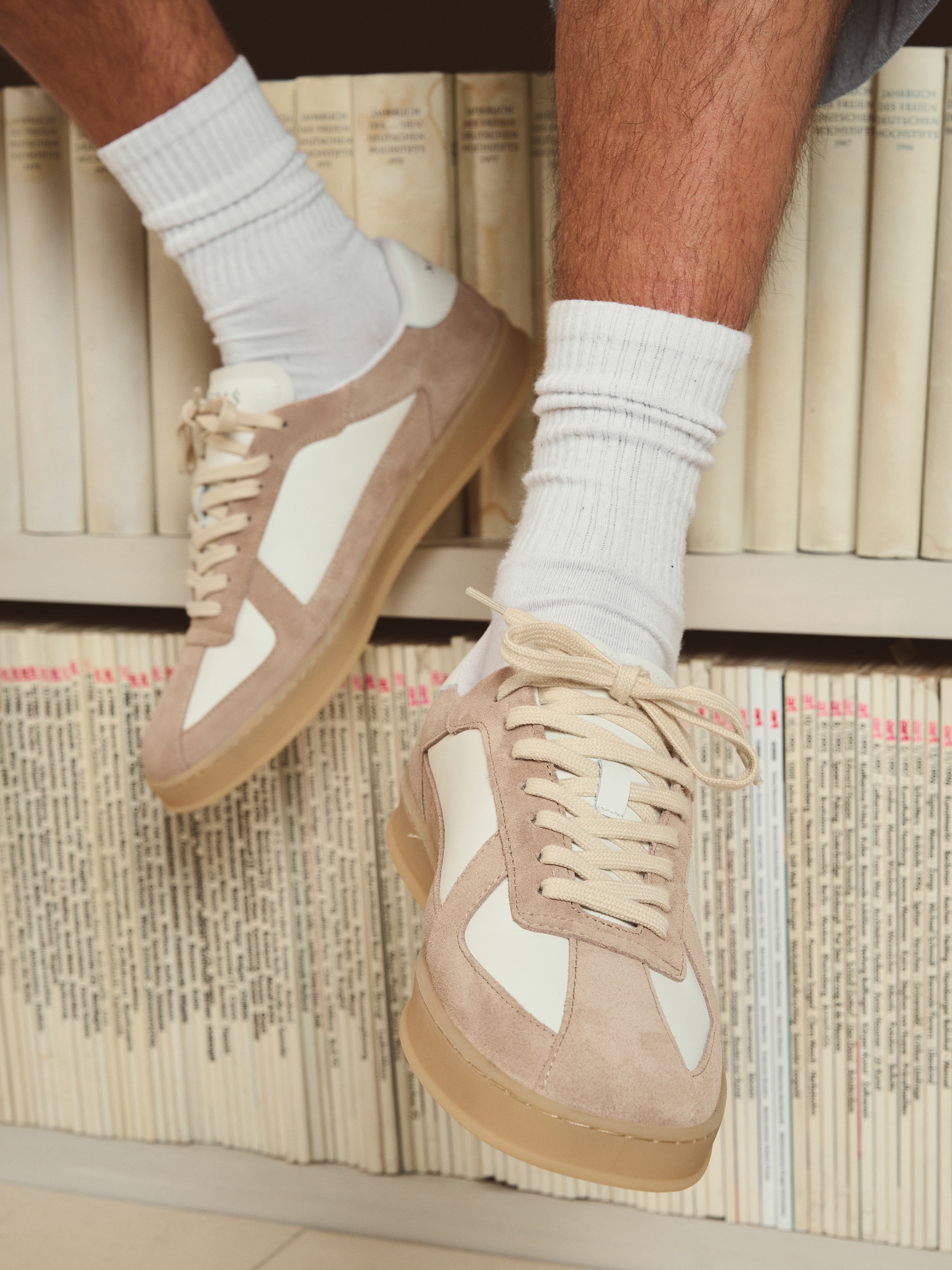 Wir stellen vor: Helios, eine moderne Neuinterpretation des ikonischen German Army Trainers. Der Helios-Sneaker verbindet das traditionelle athletische Design mit dem unverkennbaren avantgardistischen Minimalismus von Numeriś. Handgefertigt in Portugal aus geschmeidigem Leder und samtigem Wildleder aus Italien, behält das Obermaterial die ursprüngliche utilitaristische Struktur des Schuhs bei und hebt sie durch hochwertige Materialien und raffinierte Details hervor.