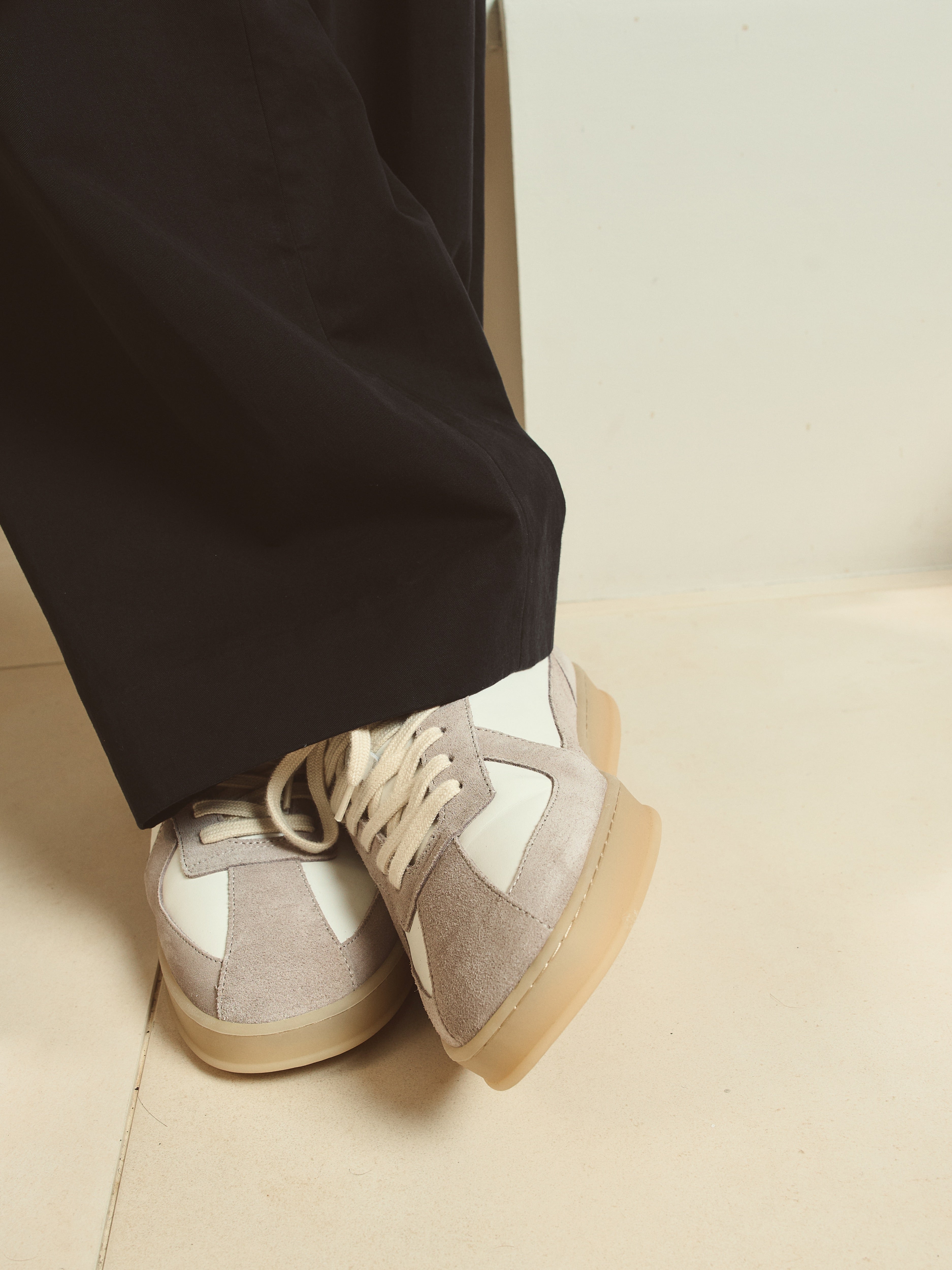 Vorstellung des Helios, einer modernen Neuinterpretation des ikonischen German Army Trainers. Der Helios-Sneaker verbindet das traditionelle athletische Design mit dem unverkennbaren avantgardistischen Minimalismus von Numeriś. Handgefertigt in Portugal aus weichem Leder und samtigem Wildleder aus Italien, behält das Obermaterial die ursprüngliche utilitaristische Struktur des Schuhs bei und hebt sie durch hochwertige Materialien und raffinierte Details hervor.