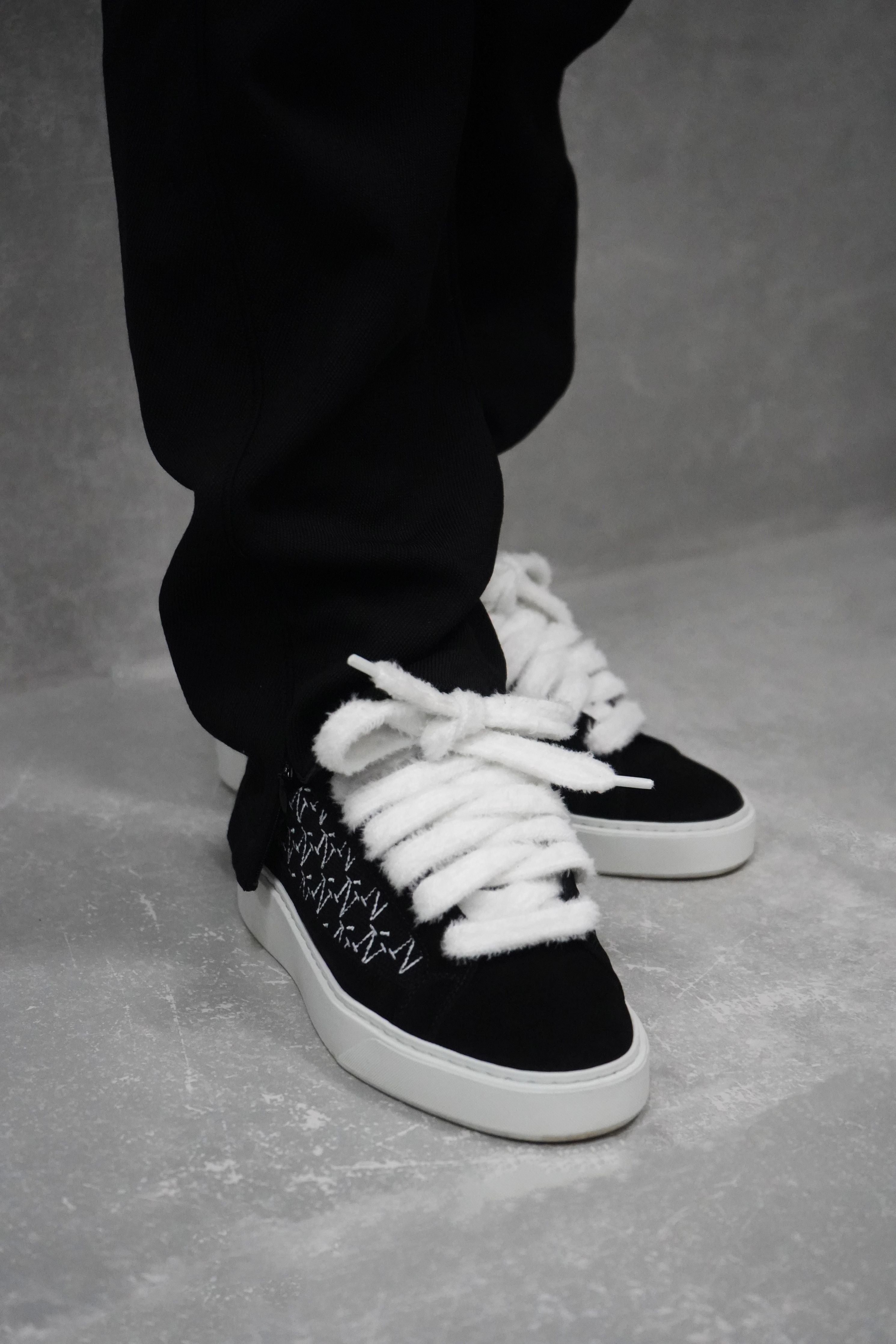 Der Sigńet Sneaker besteht aus italienischem schwarzem Wildleder, 20 mm flauschigen weißen Schnürsenkeln, hellgrauen Canvas-Seitenteilen, die von unserem eleganten, handbestickten Ń-Monogramm-Logo begleitet werden. Das Innere des Sneakers verfügt über ein graues Kragenfutter, das unvergleichlichen Komfort bietet. Das Obermaterial ruht perfekt auf unserer brandneuen, komplexen Gummisohle, die exklusiv für Sigńet hergestellt wurde. Unser markantes silbernes Logo ist über der Zunge positioniert.