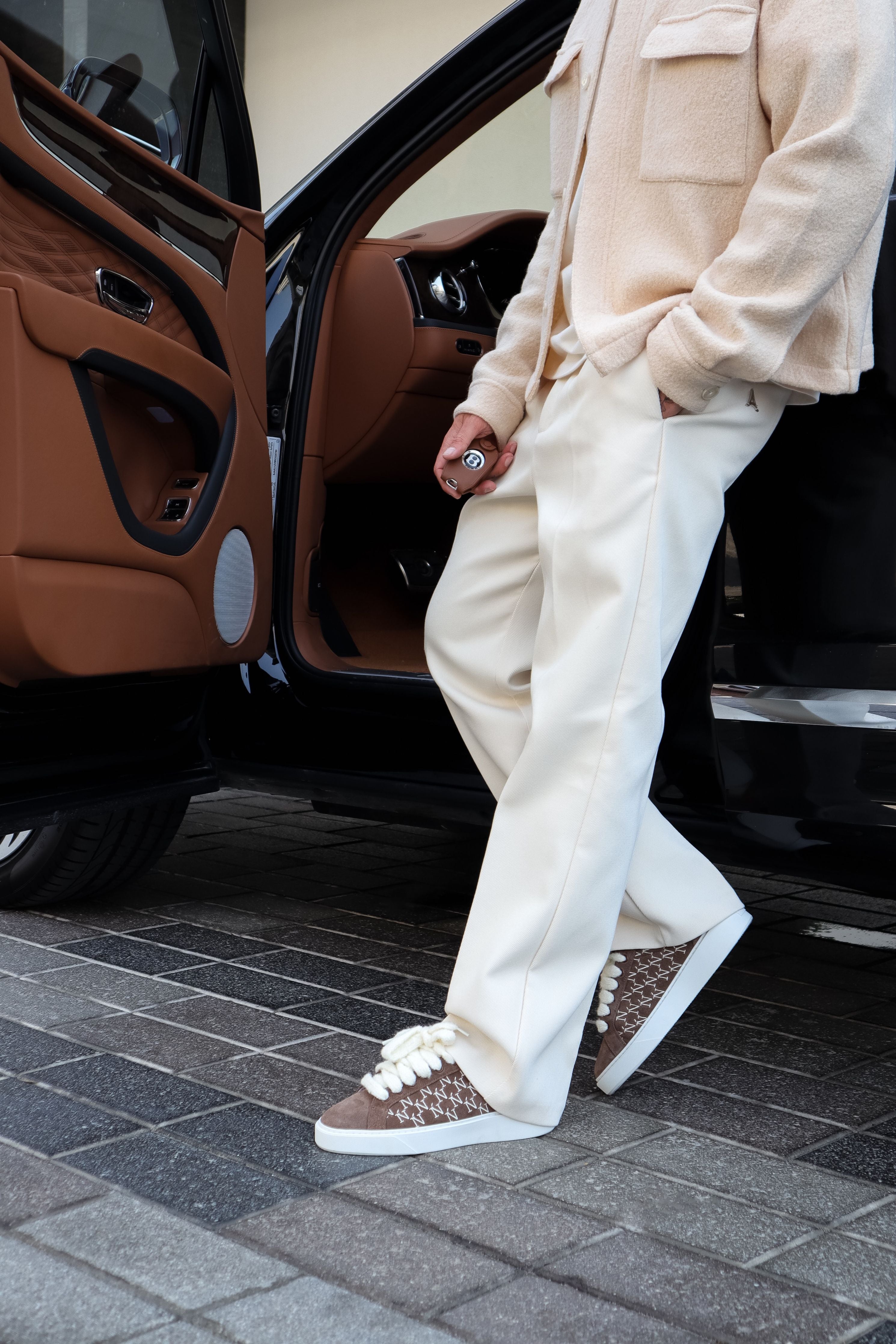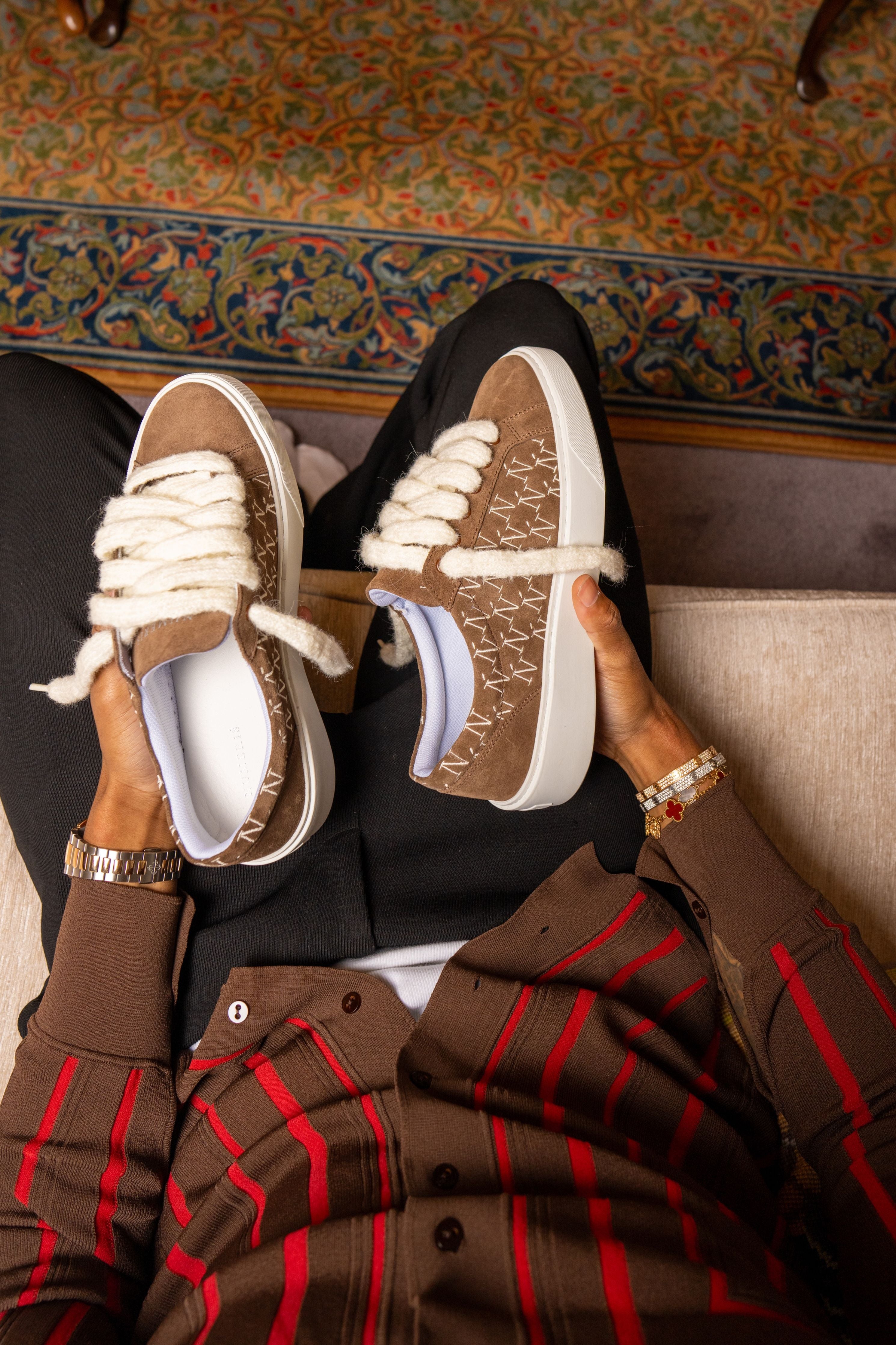 La zapatilla Sigńet presenta un ante italiano marrón claro, cordones blancos de mohair de 10 mm y paneles laterales a juego, acompañados por nuestro elegante logo monograma Ń bordado a mano. El interior de la zapatilla cuenta con un forro blanco en el cuello que proporciona una comodidad inigualable. La parte superior descansa perfectamente sobre nuestra nueva suela de goma compleja, hecha exclusivamente para Sigńet. Nuestro distintivo logo plateado está posicionado en la lengüeta.