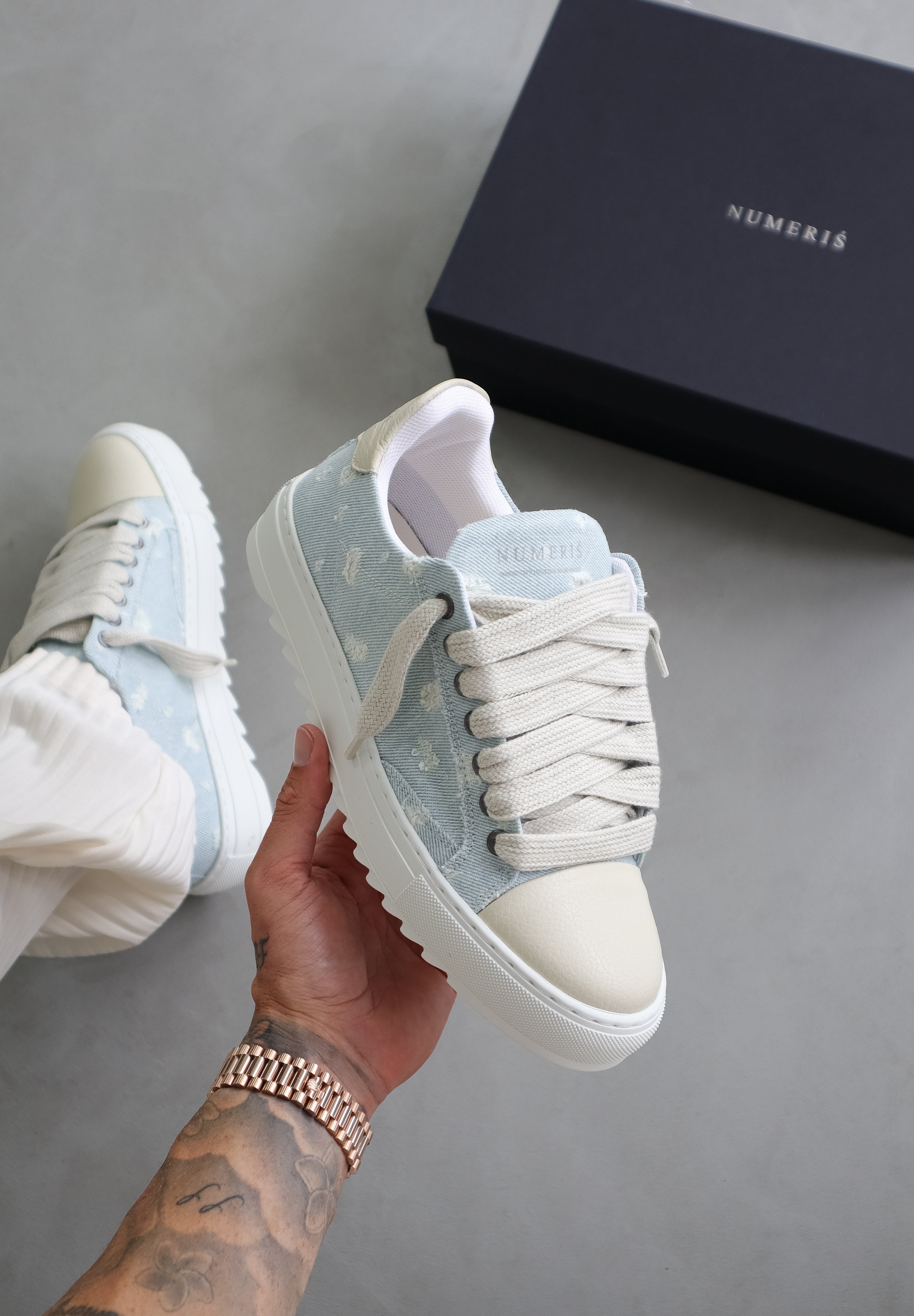 Confectionnée avec une attention méticuleuse aux détails, la tige en denim clair délavé et usé à la main sur mesure garantit que chaque paire est une œuvre d'art unique, car aucune paire ne portera le même motif usé. Complétant cette caractéristique distinctive, la coque d'orteil en cuir grainé blanc vintage signature ajoute une touche de sophistication au design. À l'intérieur, la chaussure dispose d'une doublure de col confortable qui améliore l'expérience de port globale. Les touches finales incluent notre marquage distinctif Numeriś sur le talon, accompagné du slogan définissant le style, « Le design est la pensée rendue visuelle. »