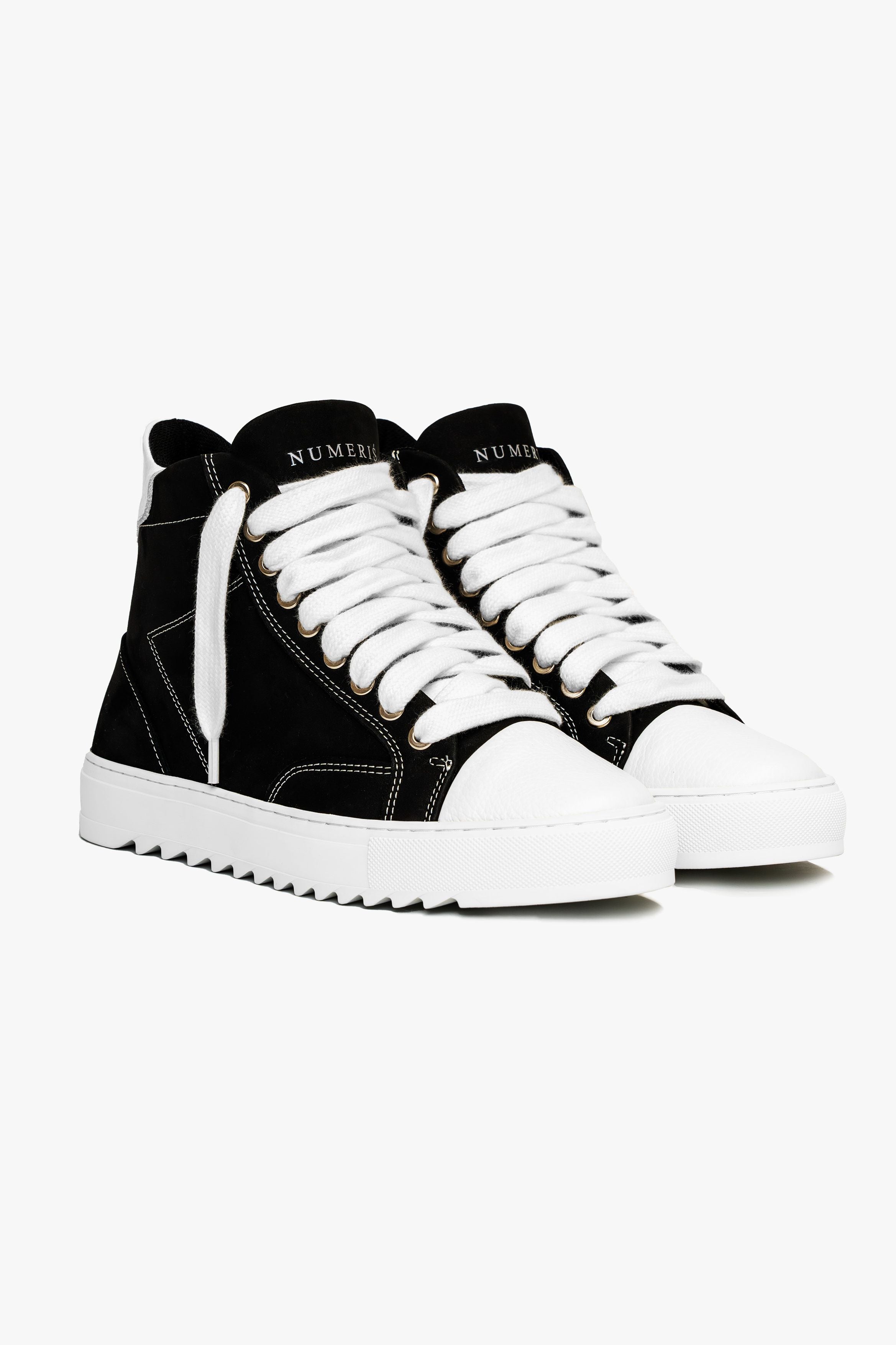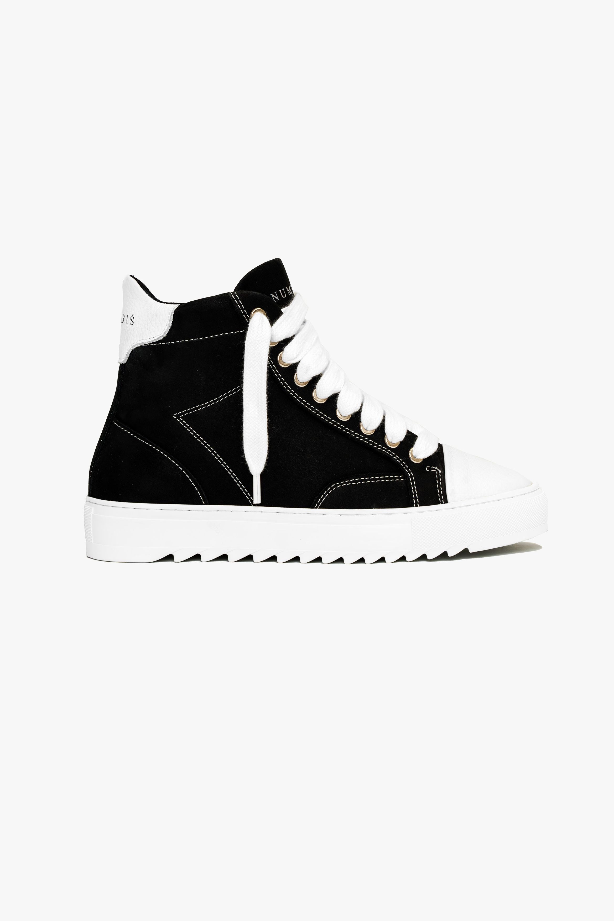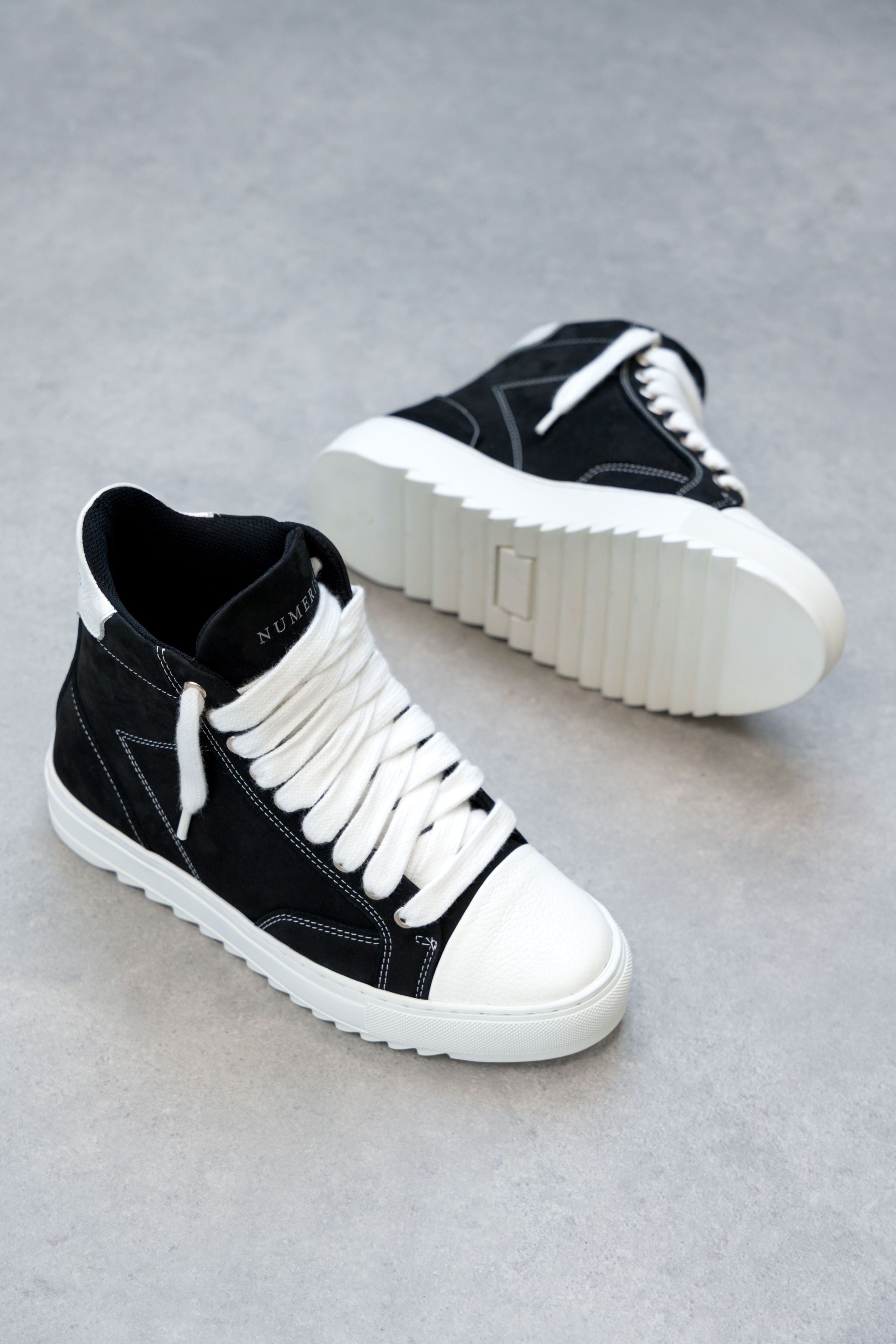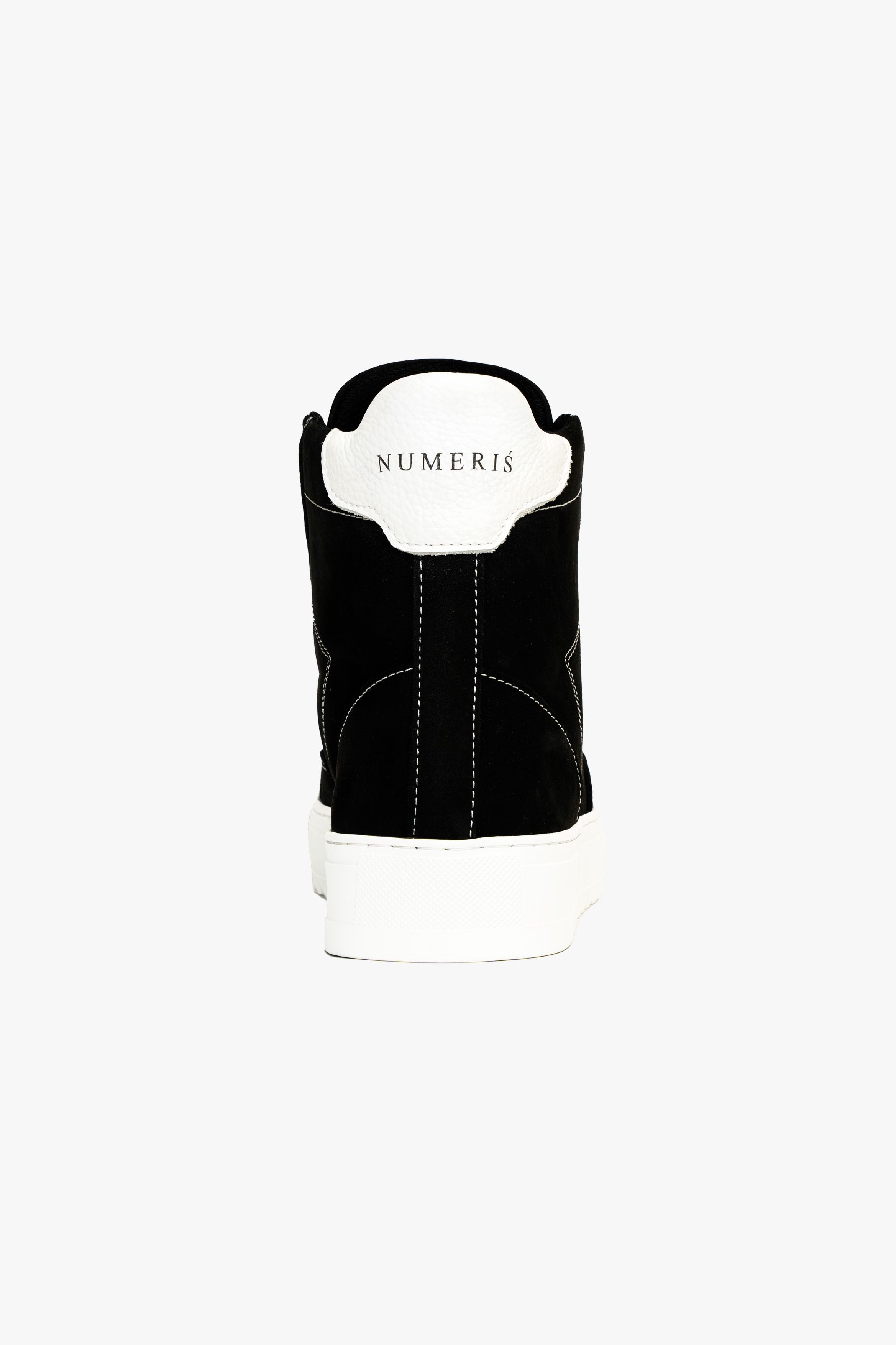 The Atelier trainer was inspired by Parisian lifestyle. Every stitch and detail was meticulously designed in a Parisian workshop. The Atelier High features a premium black nubuck upper with crisp white stitching and finished with our signature pebbled leather white toe cap. The interior of the trainer features collar lining providing unrivalled comfort. The final touches see our Numeriś branding on the heel and tongue of the shoe.