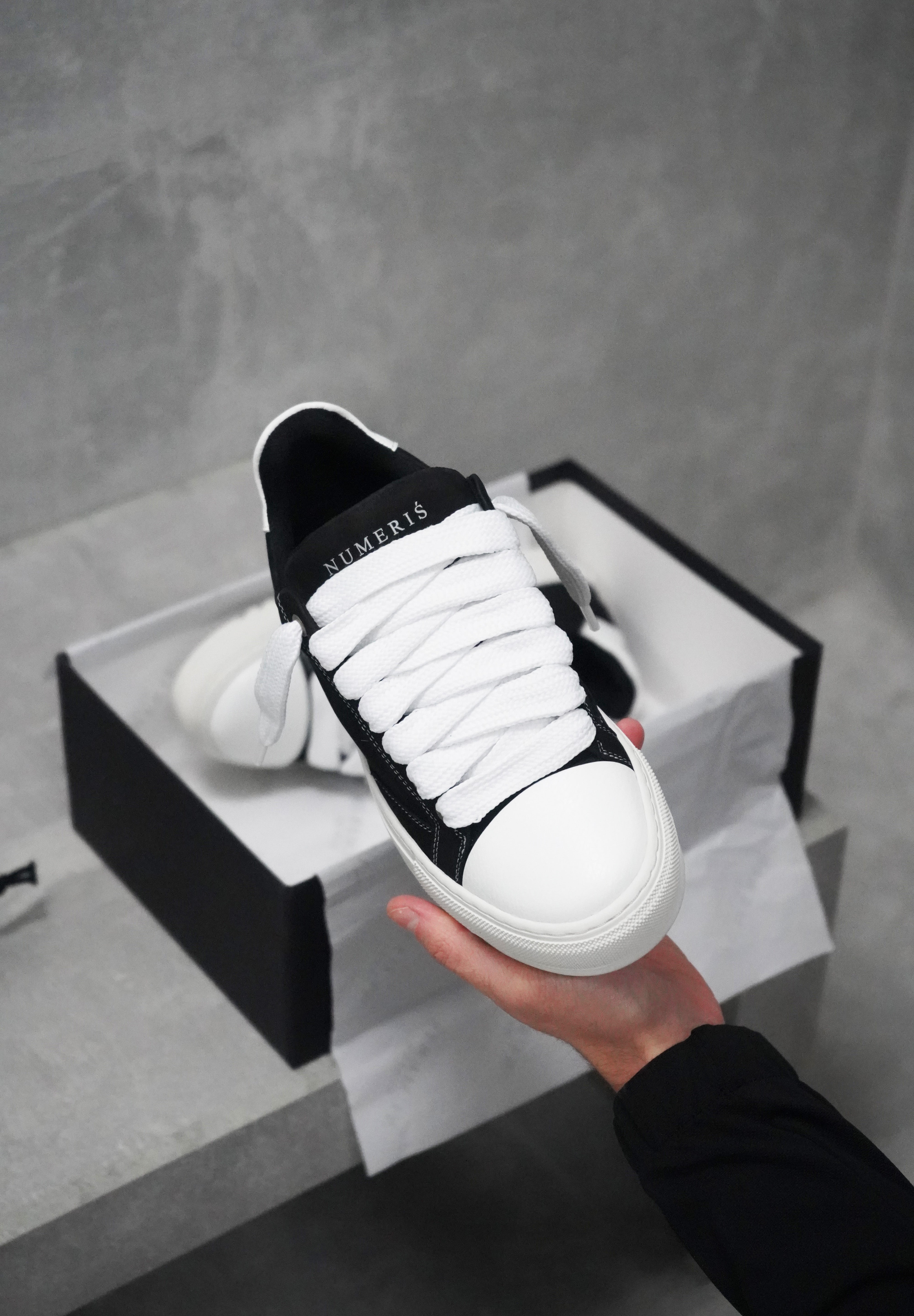 The Atelier trainer was inspired by Parisian lifestyle. Every stitch and detail was meticulously designed in a Parisian workshop. The Atelier features a premium black nubuck upper with crisp white stitching and finished with our signature pebbled leather white toe cap. The interior of the trainer features collar lining providing unrivalled comfort. The final touches see our Numeriś branding on the heel of the shoe, with our slogan for this style 'Design is thinking made visual' on the tongue.