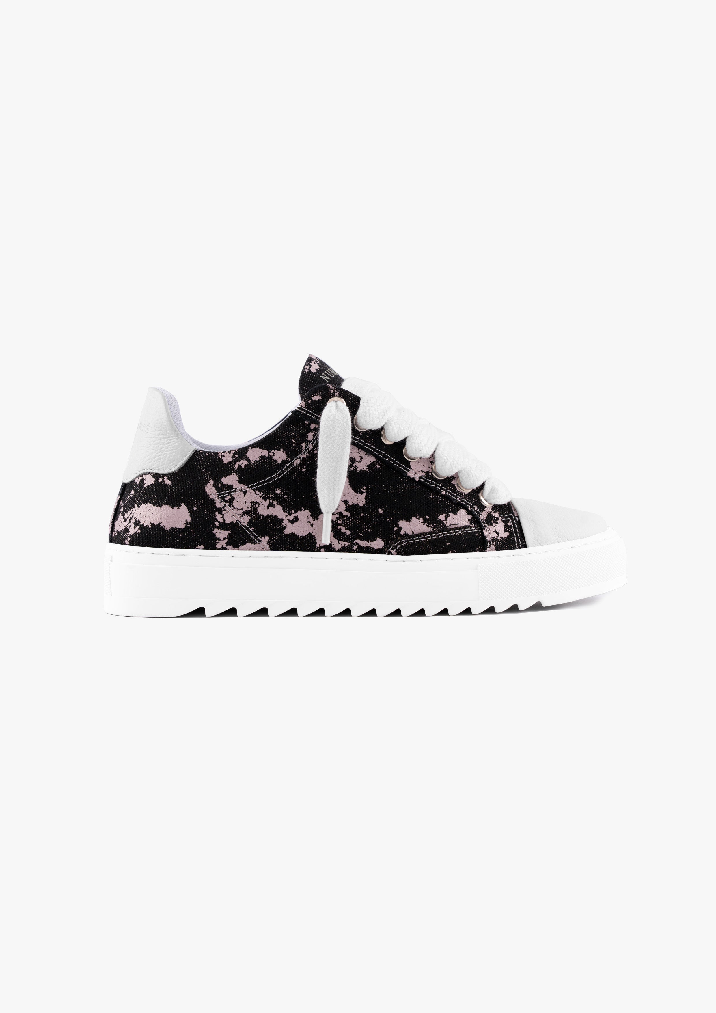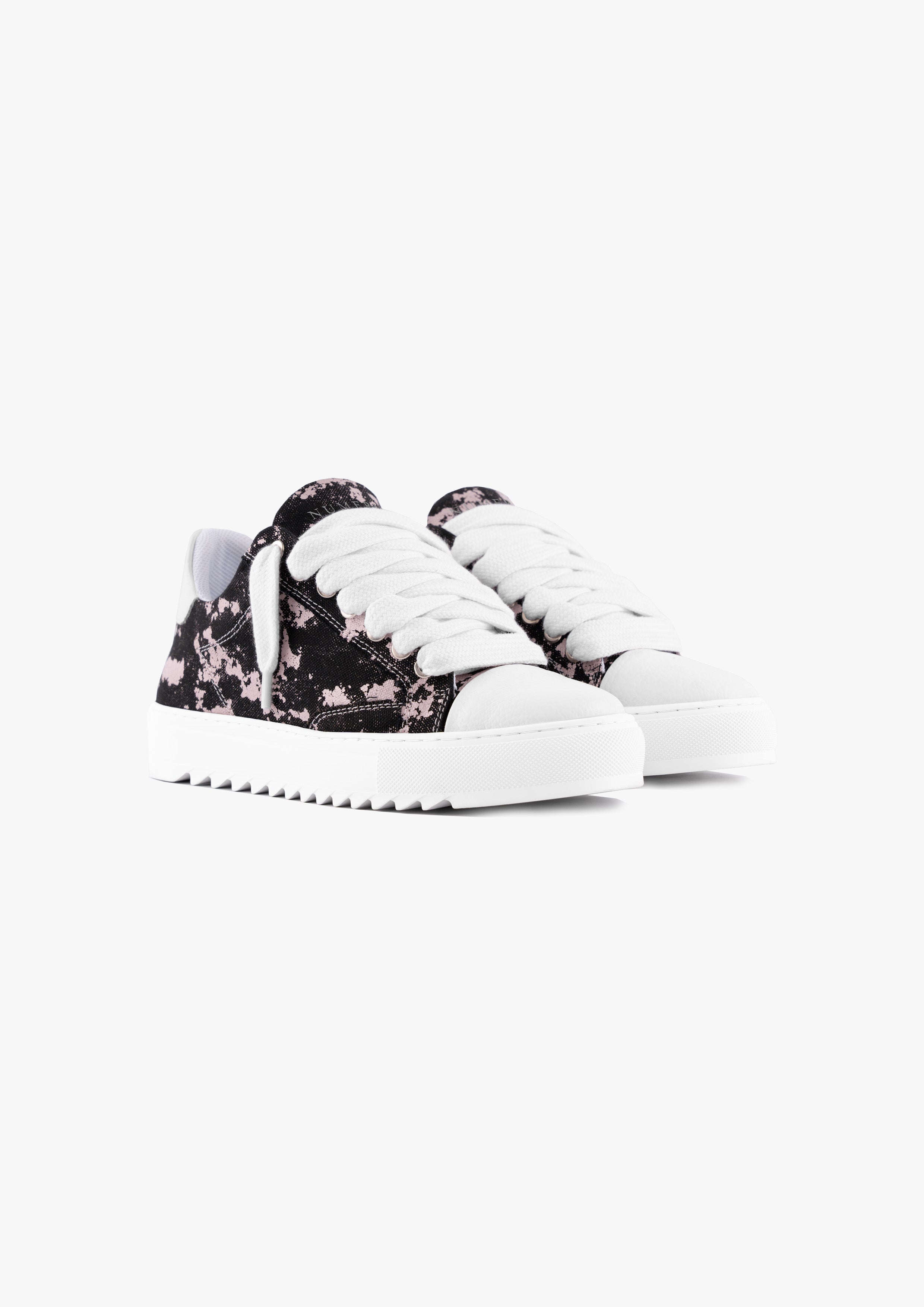 Crafted with meticulous attention to detail, the bespoke hand-dyed canvas upper ensures that each pair is a unique work of art, as no two pairs will bear the same pattern. Complementing this distinctive feature is the signature crisp white pebbled leather toe cap, adding a touch of sophistication to the design. Inside, the trainer boasts a comfortable collar lining that enhances the overall wear experience. The finishing touches include our distinctive Numeriś branding on the heel.