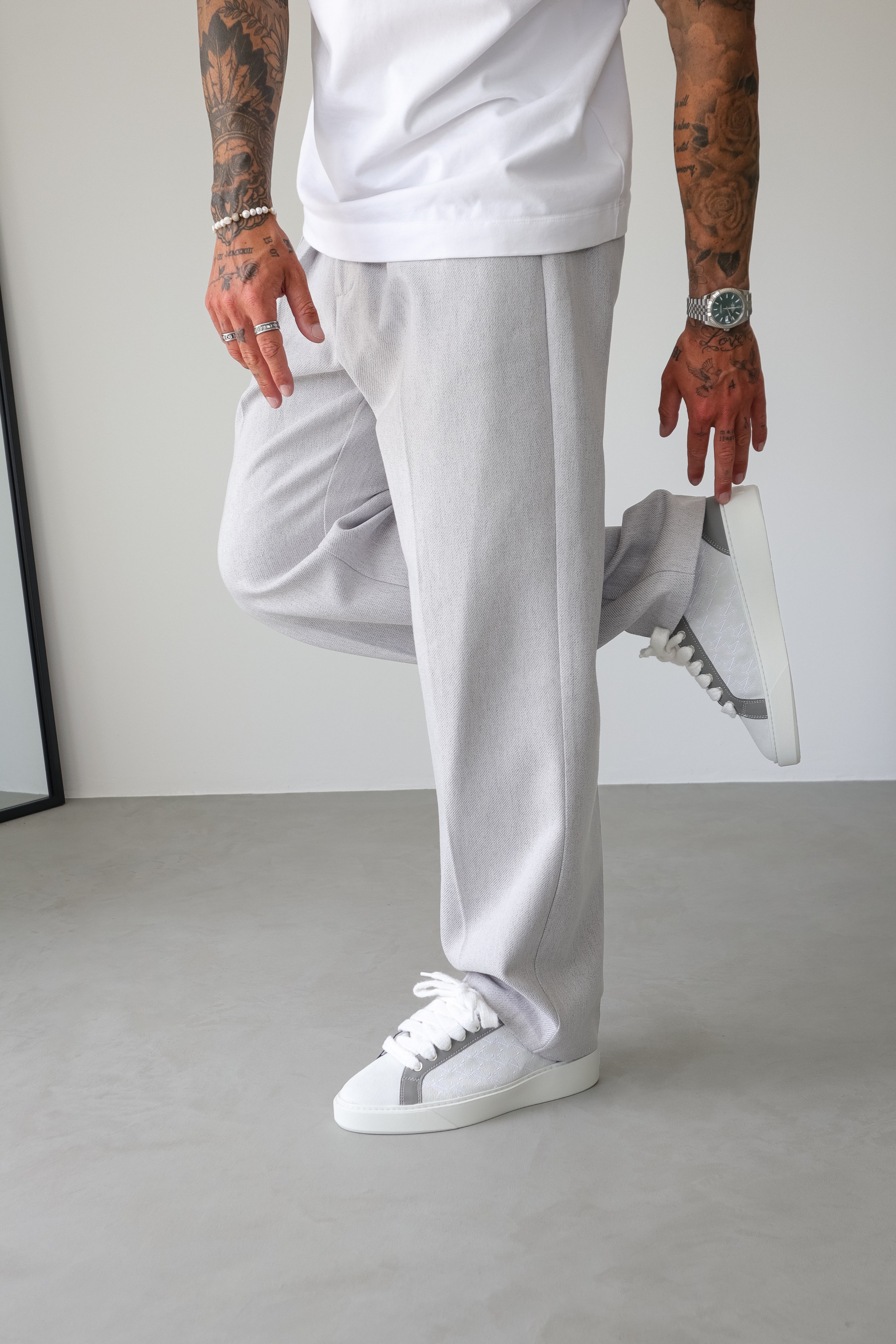 The Graphite colourway features Italian light grey, 10mm mohair white laces, light grey side panels and bespoke leather reinforced by TPU running down the eyestay. Which are accompanied by our sleek hand embroidered Ń monogram logo. The interior of the sneaker features black collar lining providing unrivalled comfort. The upper rests perfectly on top of our brand new complex rubber sole, exclusively made for Sigńet. Our distinct silver logo is positioned across the tongue.