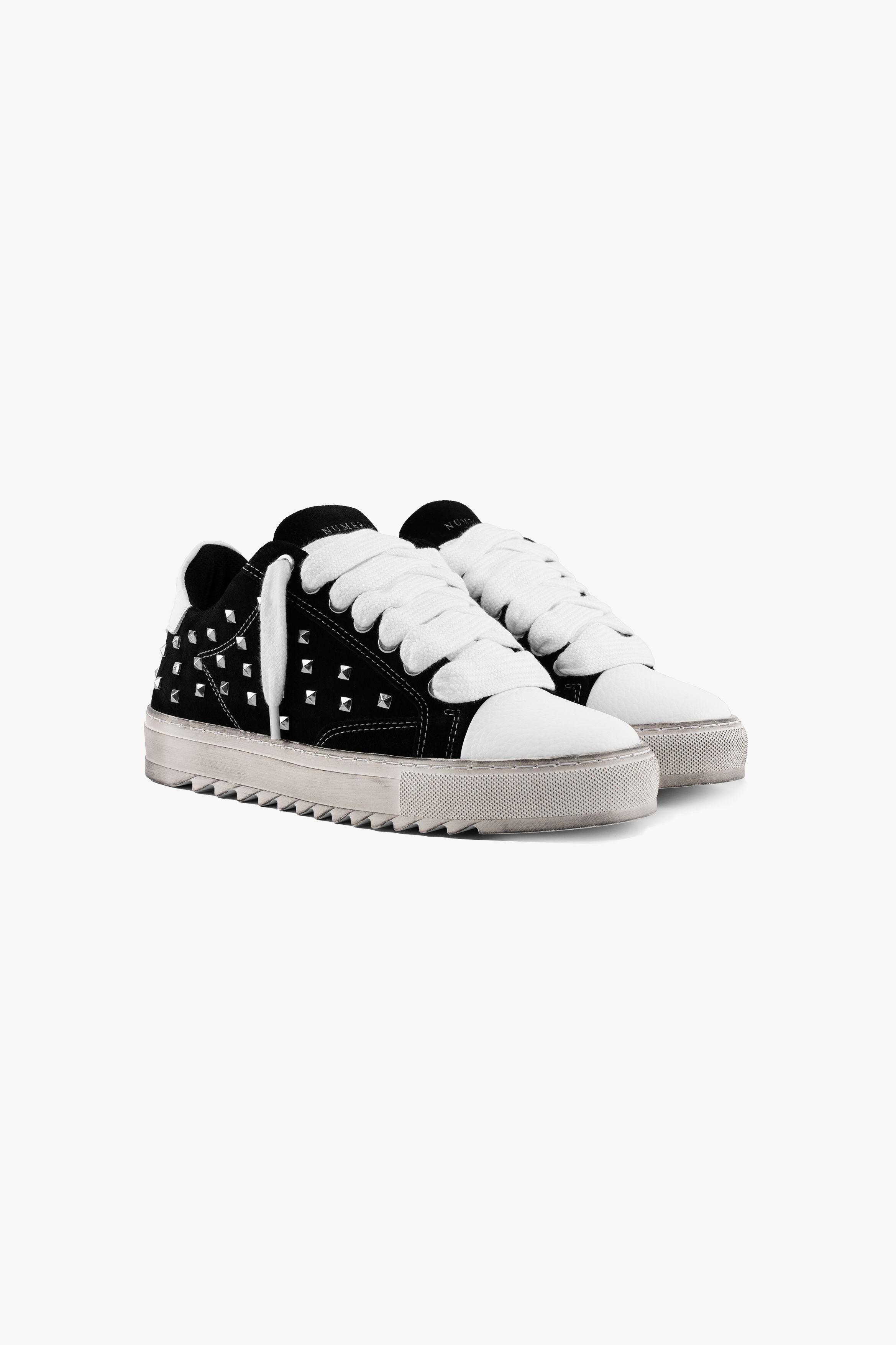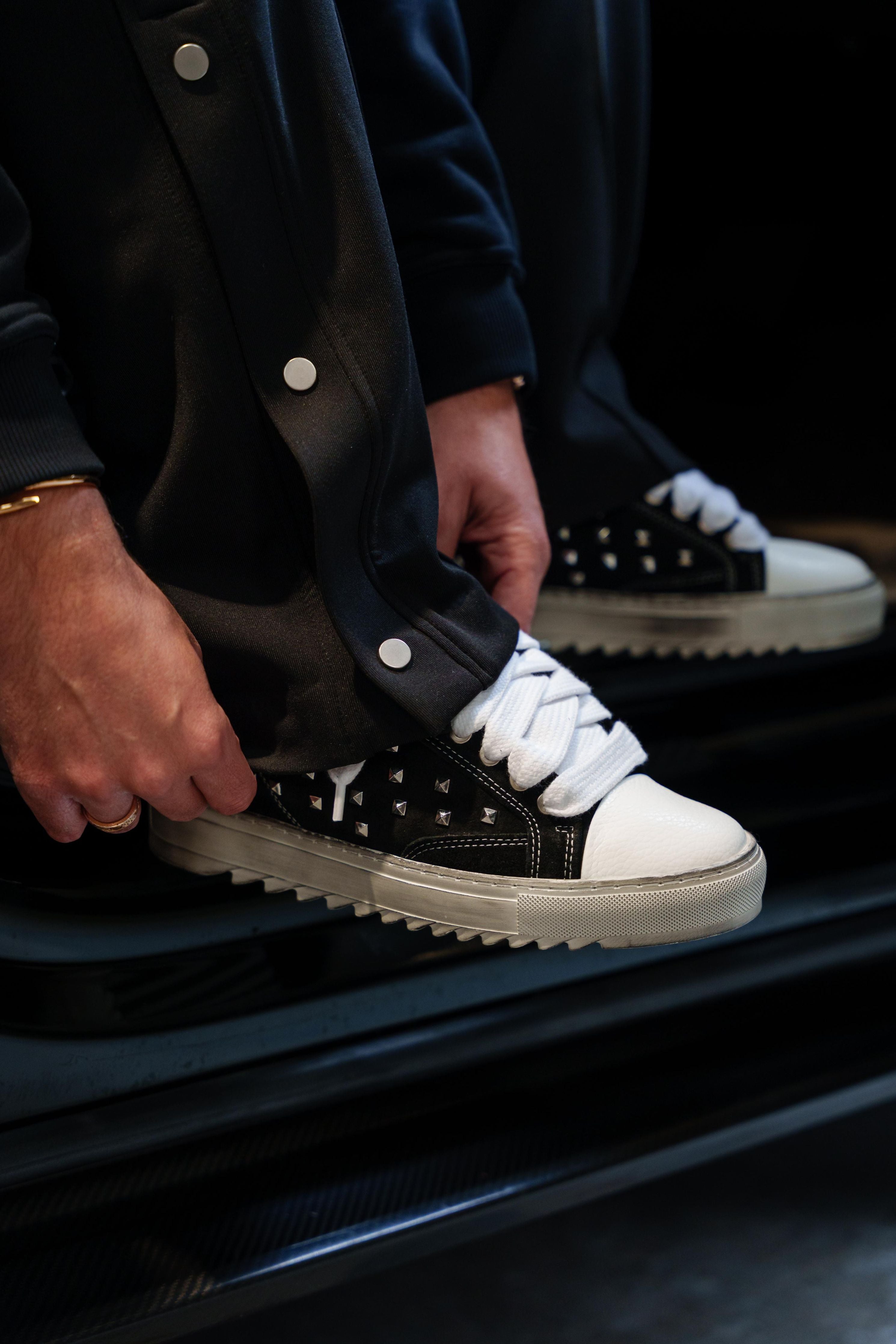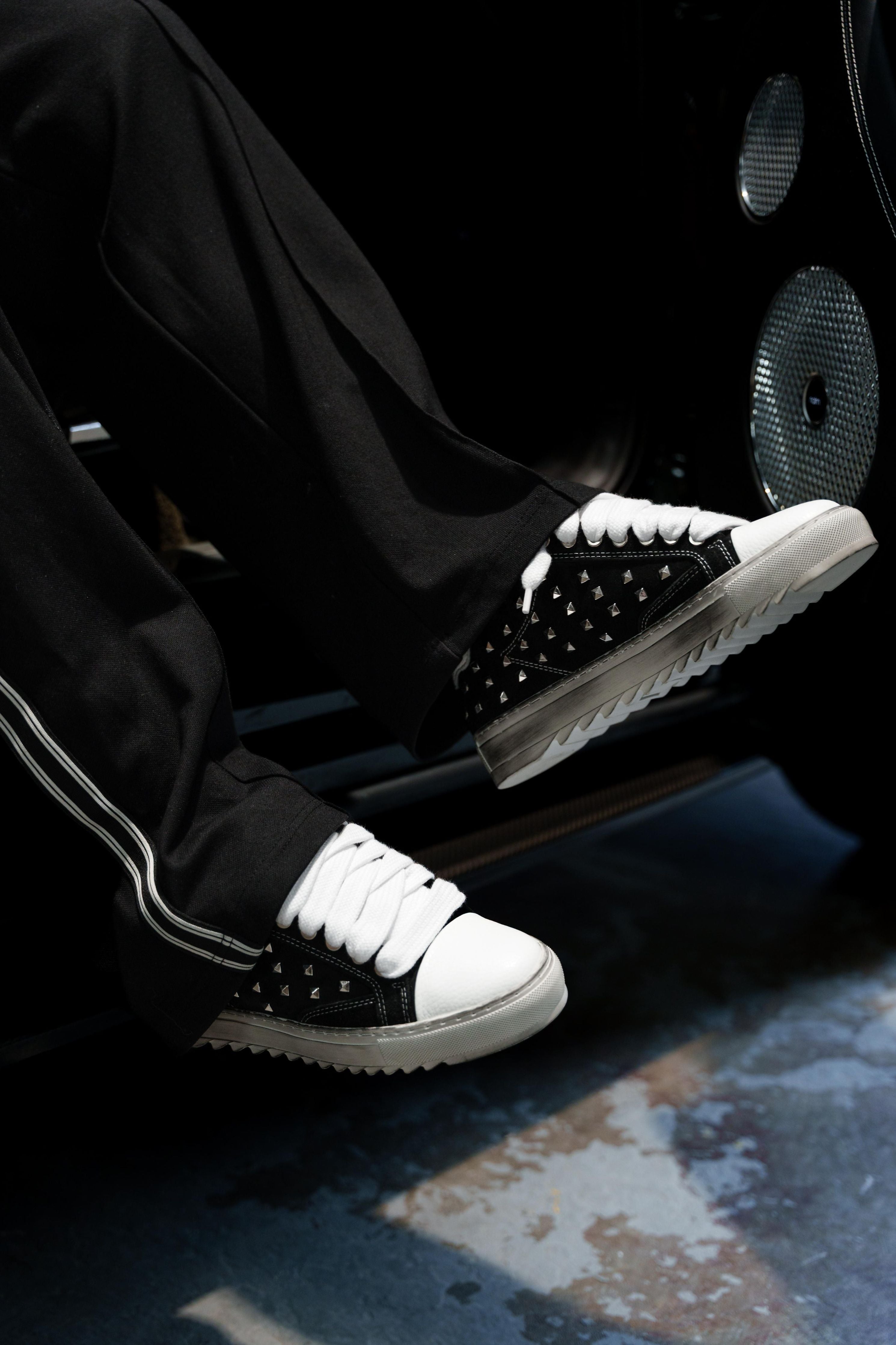 O Atelier trainer personifica a essência do estilo de vida parisiense, concebido com precisão num atelier parisiense. Cada ponto e detalhe reflectem um desenho meticuloso, garantindo uma sensação refinada e luxuosa. A variante de cor Diesel Black apresenta um cabedal integral em camurça italiana preta premium, acentuado com tachas metálicas prateadas ao longo das painéis laterais. Costuras brancas nítidas realçam a estética sofisticada, enquanto a nossa biqueira em pele granulada cinzenta assinatura acrescenta um toque distintivo.