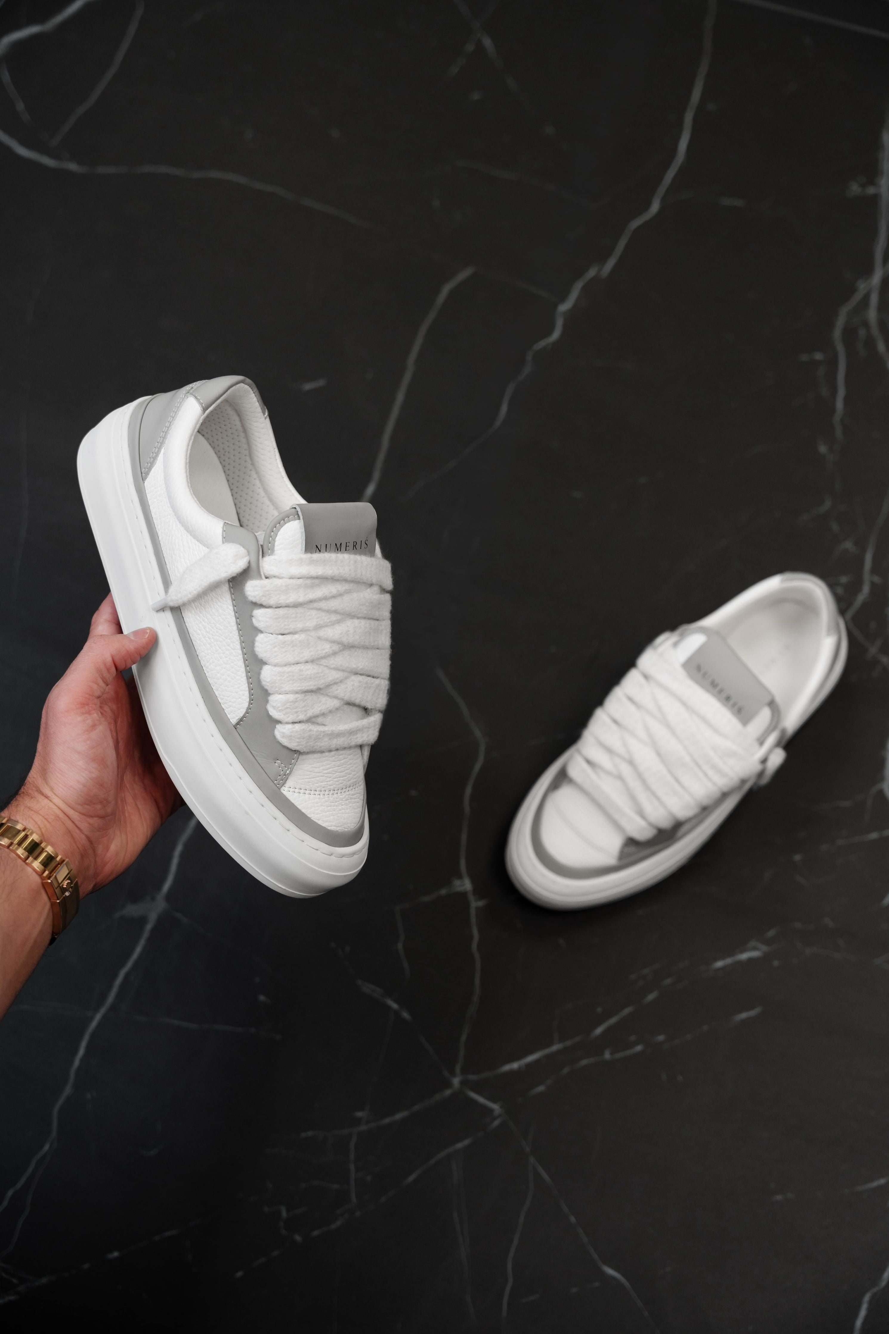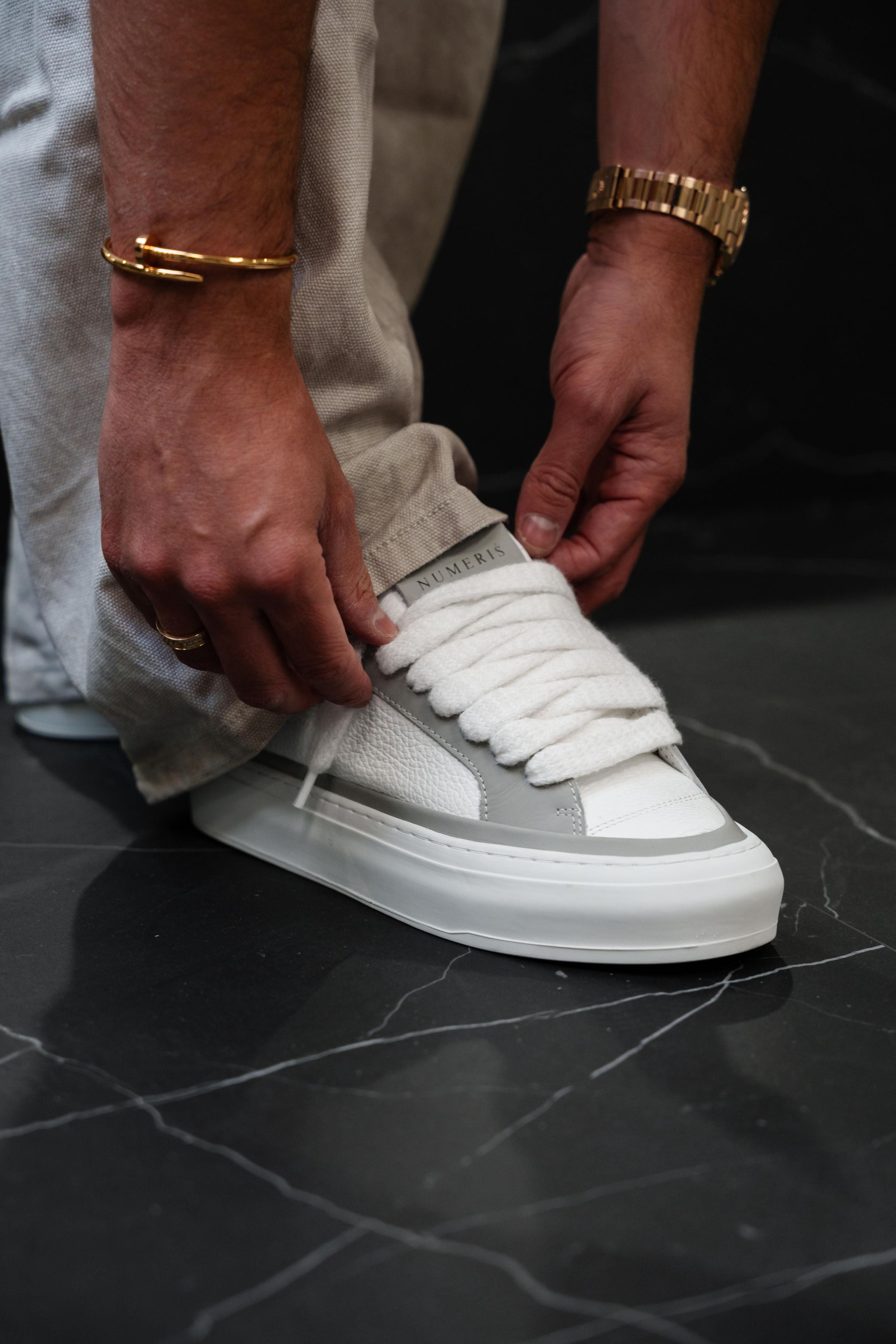 Färgvarianten Sail består av en blandning av exklusiva italienska läder och förstärkt TPU-läder. Ultrasmjuka vita mohair-snören, och vår signatur Numeriś tungtagg — allt ovanpå en helt ny, specialkonstruerad sula framtagen exklusivt för Athena-serien.