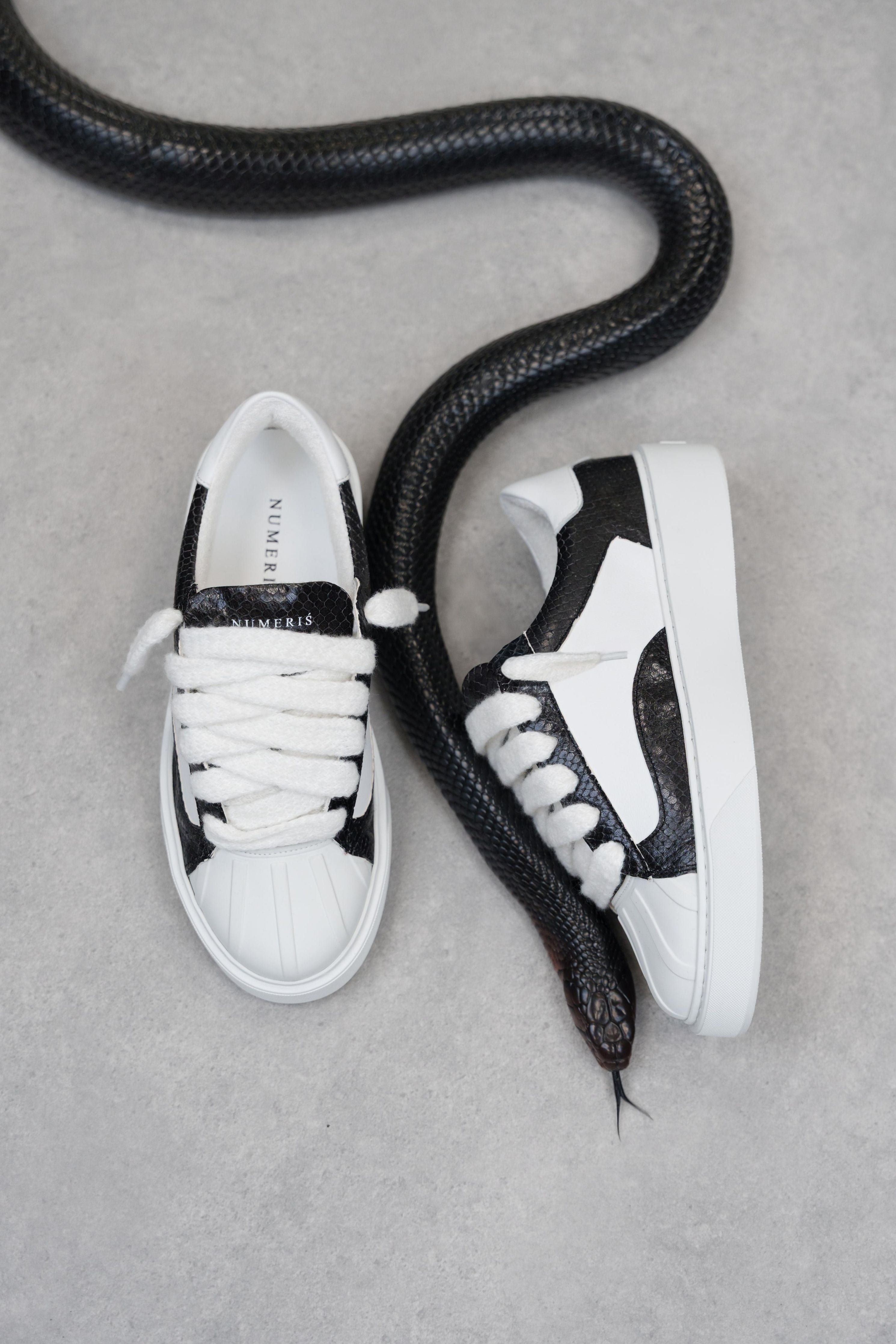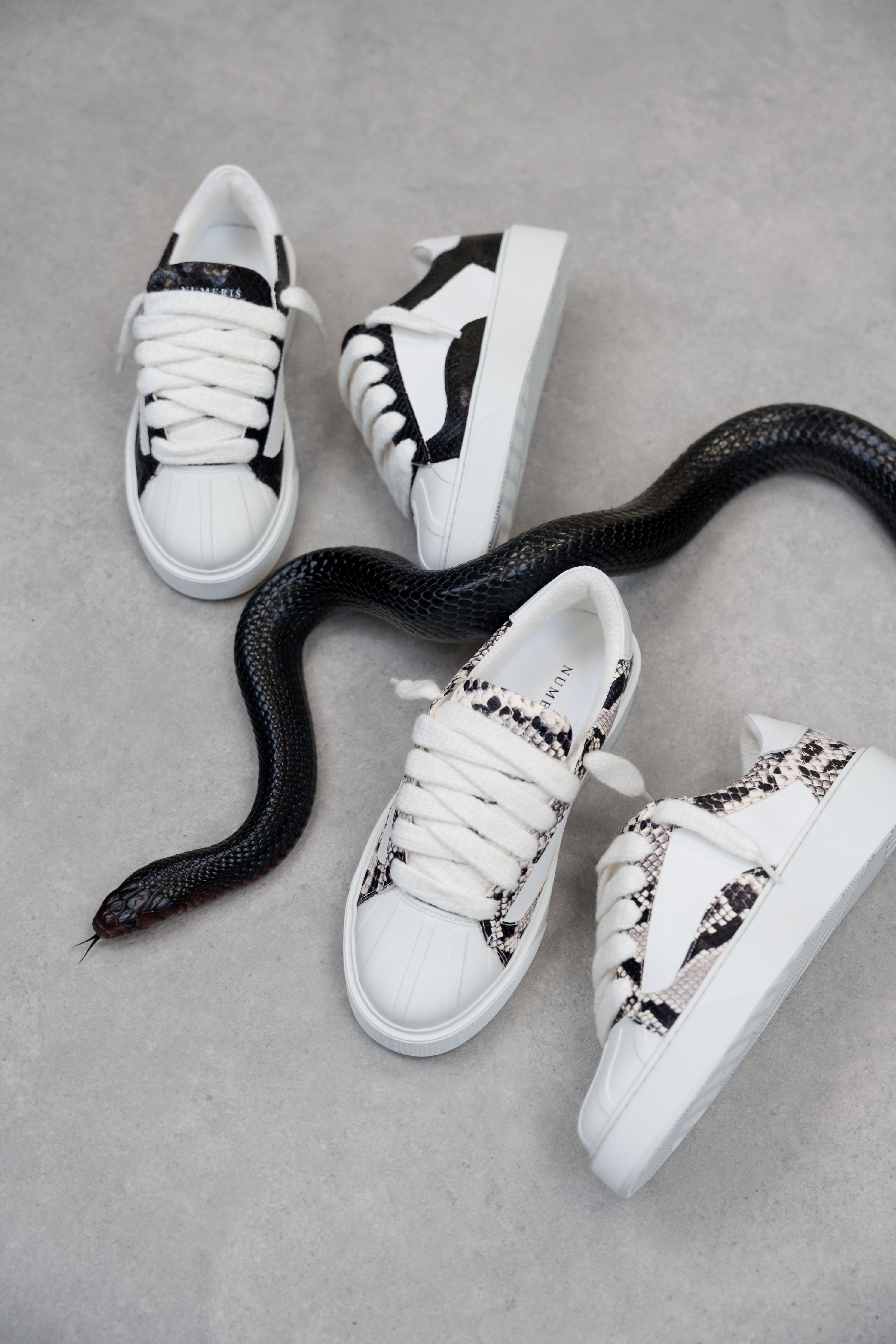 The Python Black colourway features a full white Italian leather upper. With 10mm wide beige mohair laces, each pair is soft to the touch and slightly textured. Numeris branding is positioned along the tongue, creating a clean aesthetic. All of this rests upon our custom-engineered beige sole, developed exclusively for the Eclipse - to support the beige rubber shell toe. Fit is true to size but if you are in between sizes please choose the nearest size down.